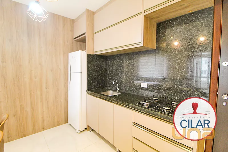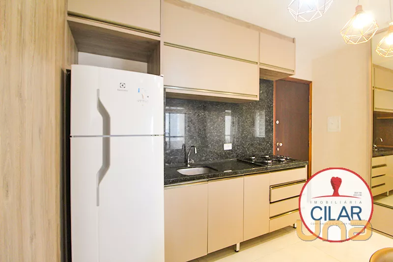 Quarto com cama box casal, criado mudo, closet, mesa com 1 cadeira; Sala com sofá 2 lugares, painel de TV, armários; Sacada; Banheiro com chuveiro elétrico; Cozinha com armários planejados, pia com balcão e pedra granito, refrigerador, cooktop, mesa passa prato com 3 cadeiras.