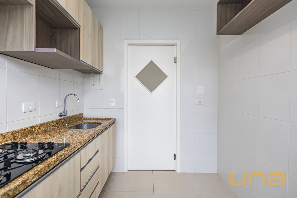 Apartamento de 2 quartos com sala para 2 ambientes, piso frio, banheiro social com box tipo blindex, cozinha com armários planejados com fogão cooktop, área de serviço conjugada.