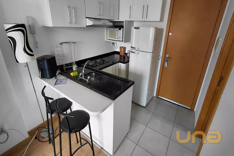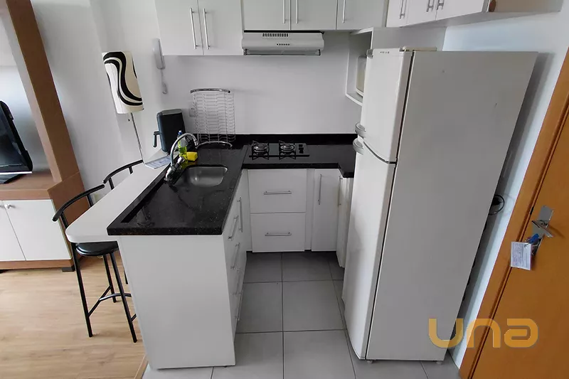 - Cozinha equipada (Pia em balcão com tampo em granito, Armários, Fogão e Geladeira).