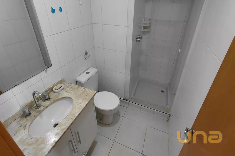 - Banheiro com balcão em granito e box em vidro.
