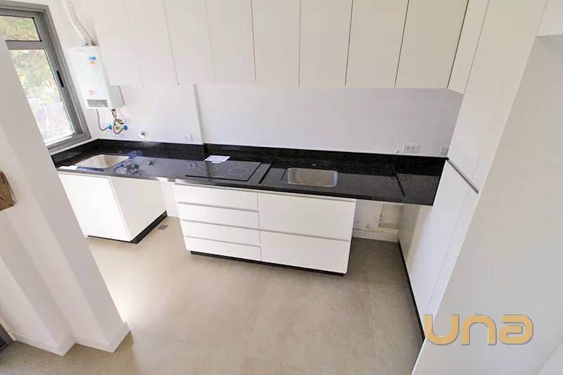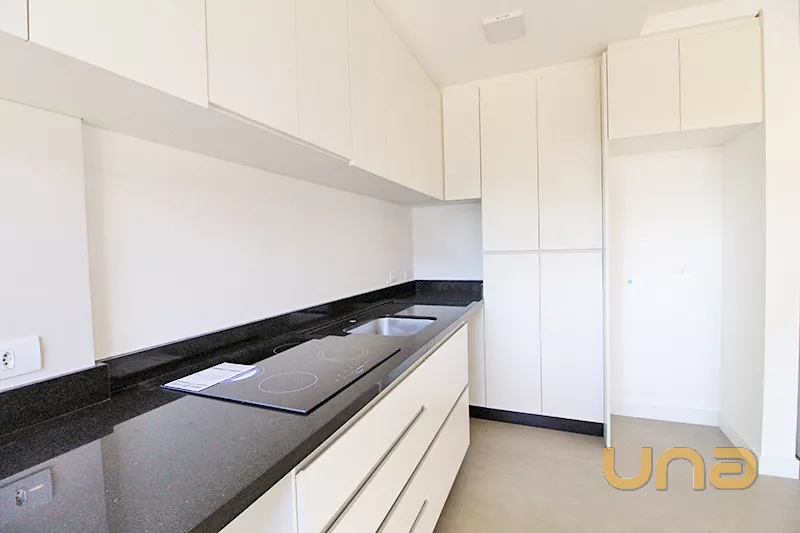 Cozinha mobiliada com armários, forno de indução e tampos em granito;