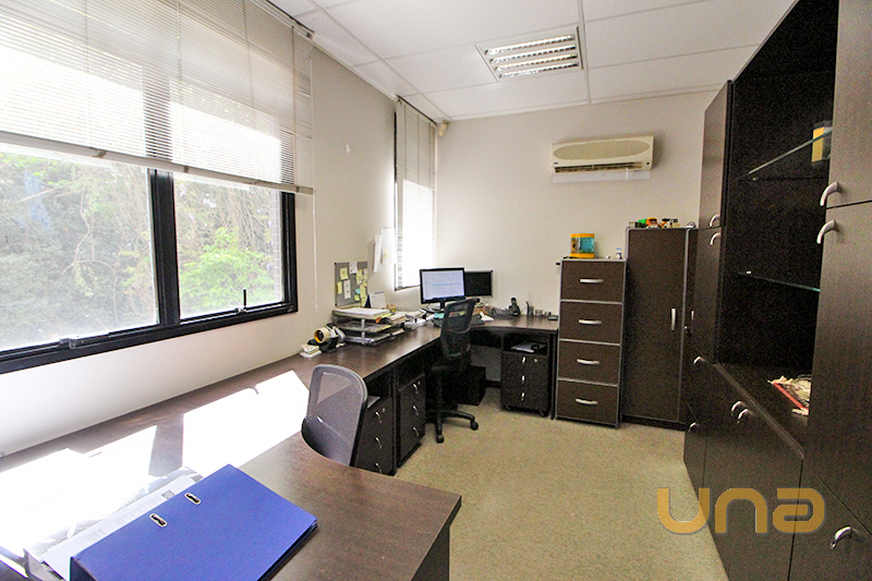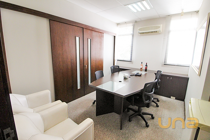 05 Salas, sendo 01 com 02 mesas e armário, 01 de reunião com mesa balcão, ar-condicionado, cadeiras e sofá, 01 com 02 mesas, persiana, ar-condicionado e balcão, 01 com persiana, balcão, ar-condicionado e 02 cadeiras;