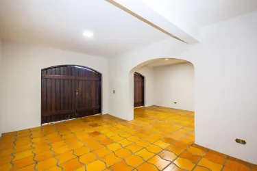 Amplo espaço frontal com possibilidade para vagas de estacionamento, com calçamento em cerâmica, e duas garagens fechadas;