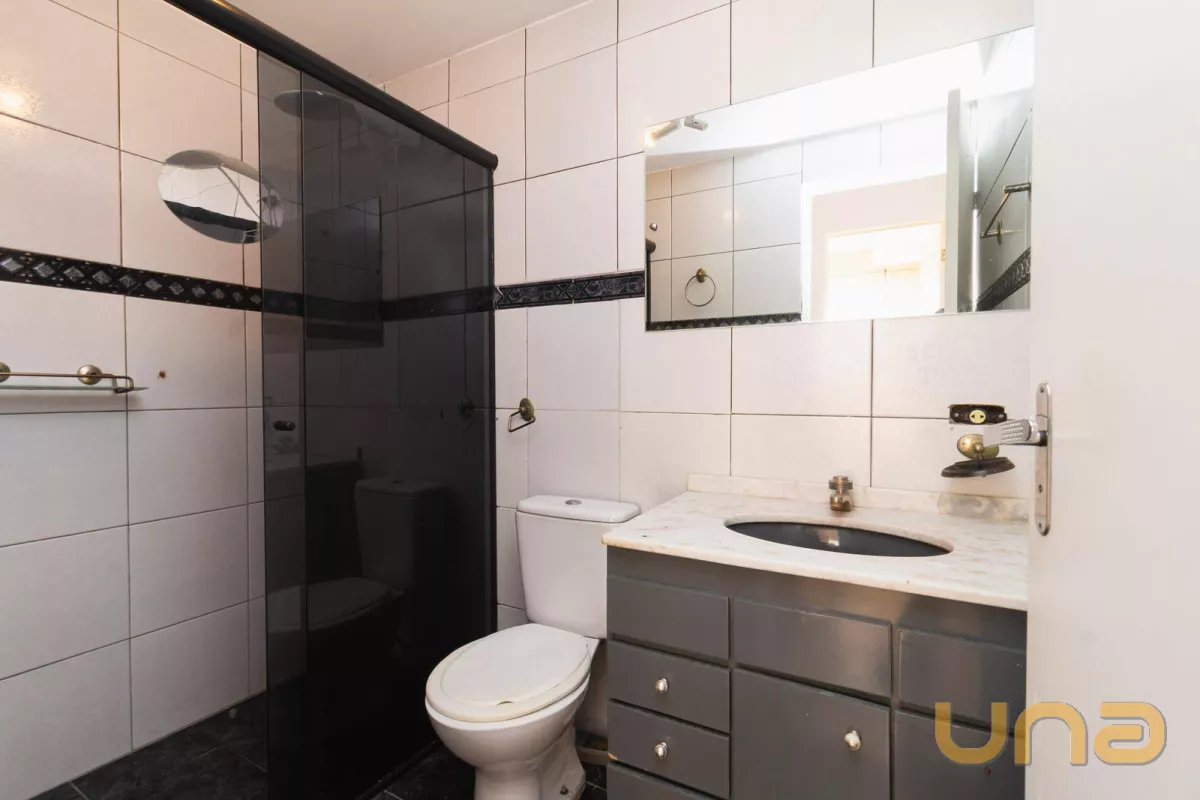 Banheiro social com box em vidro temperado (blindex), armário e espelho