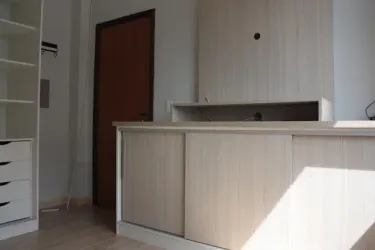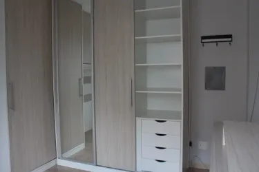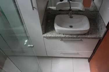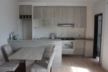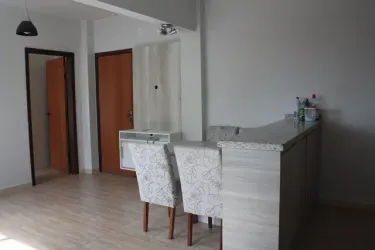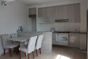 Contendo sala para 2 ambientes integrada à cozinha com rack, mesa com 4 cadeiras, armários planejados, tampo em granito com cooktop e filtro. Amplo quarto com armários planejados, banheiro com box blindex, armários e pia sobreposta.
