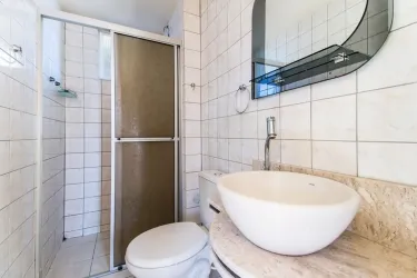 Banheiro social completo apresentando box instalado e pia com refinamento em tampo de granito
