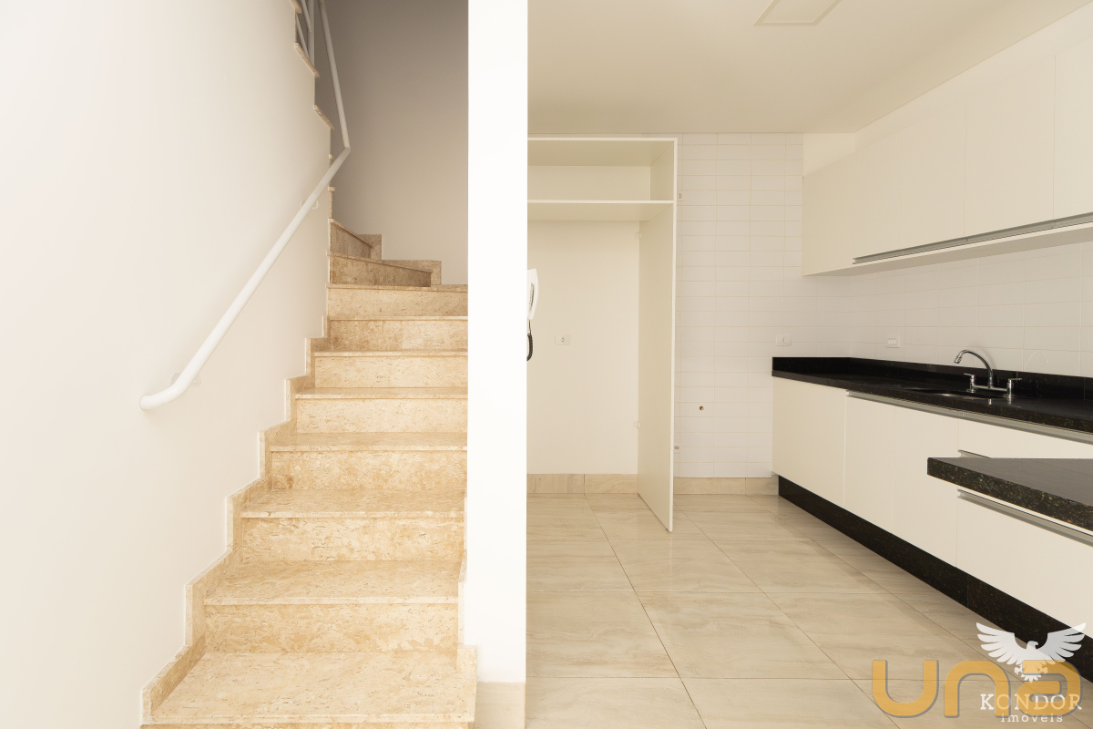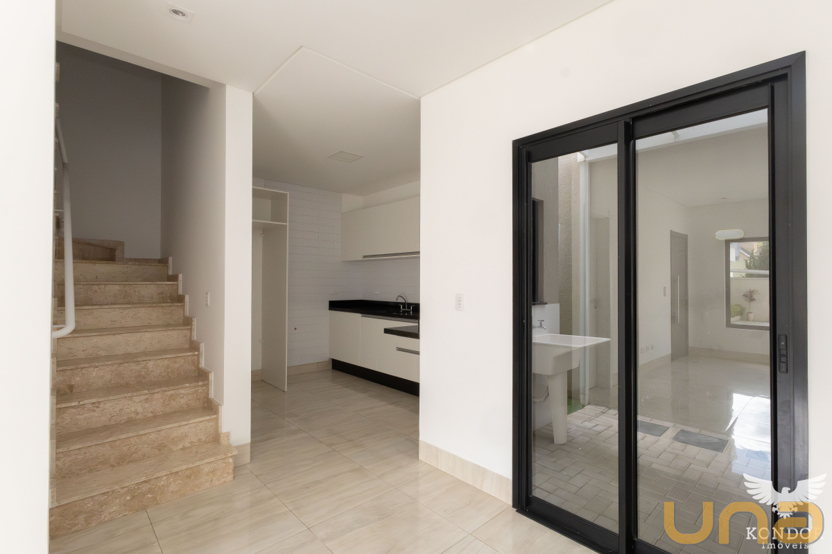 Sobrado em condomínio com sala e cozinha com piso em porcelanato, cozinha com armários com tampo em granito, lavabo e área de serviço.