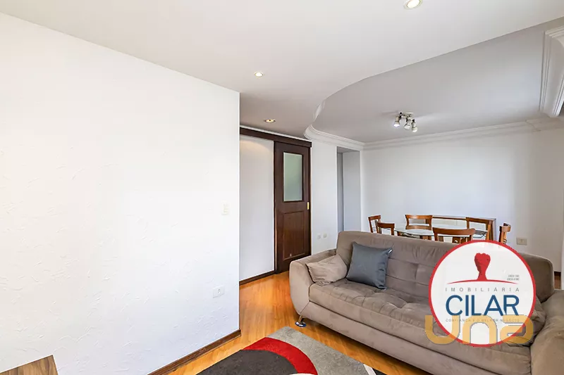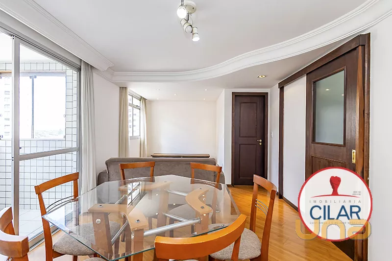 Sala para 02 ambientes, sofá, tapete, hack, mesa em vidro com 6 cadeiras, sacada com churrasqueira, fechada com cortina de vidro;