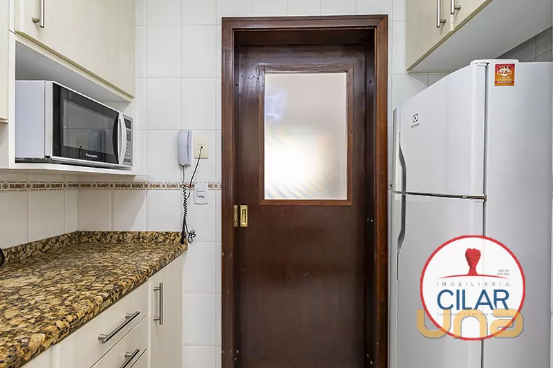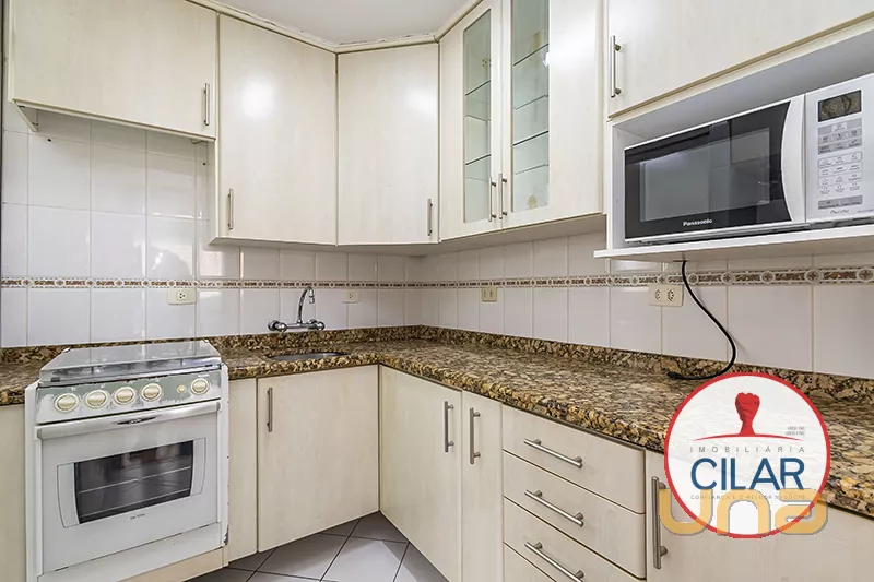 Cozinha com armários, refrigerador, fogão e micro-ondas, balcão e pia em granito;