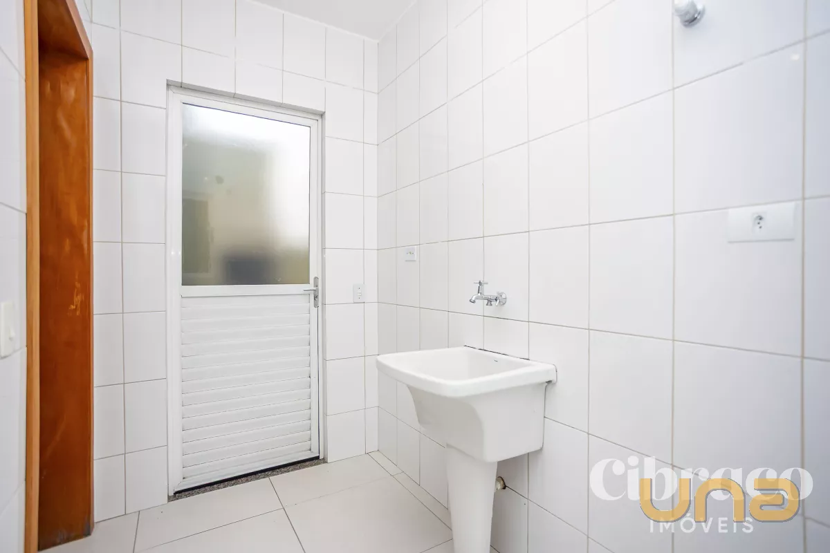 Sala para 2 ambientes, lavabo, cozinha com armários planejados e área de serviço com tanque.