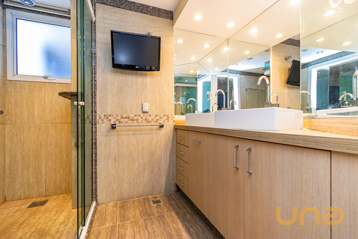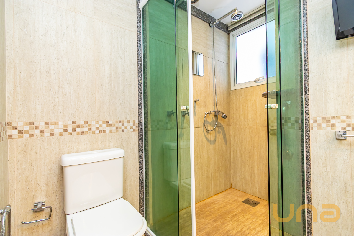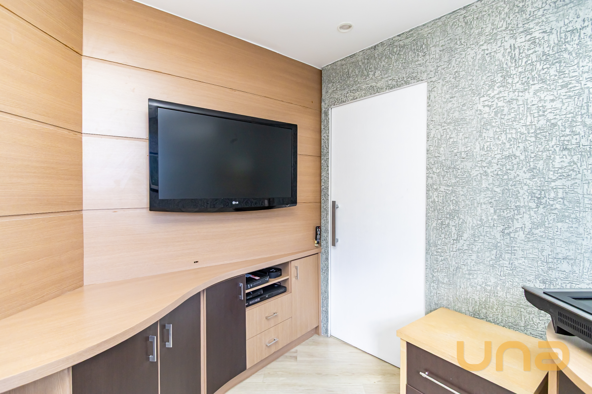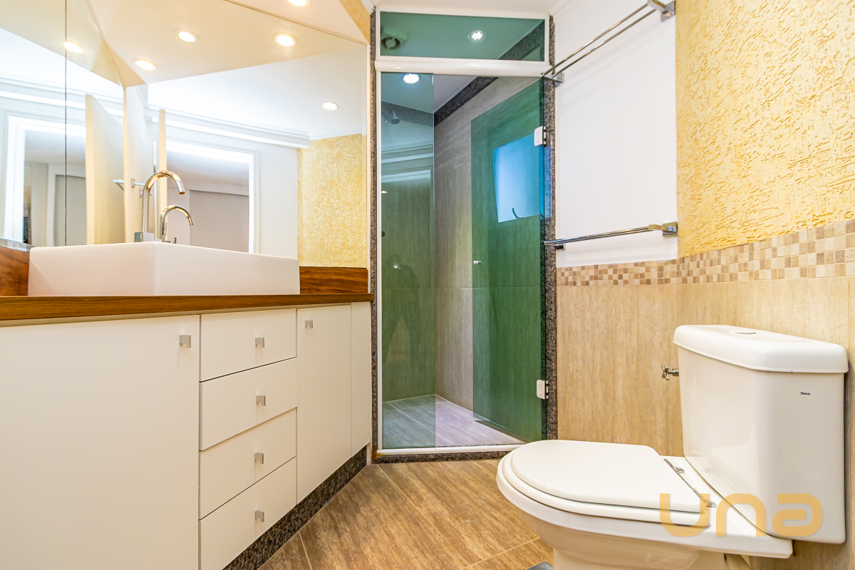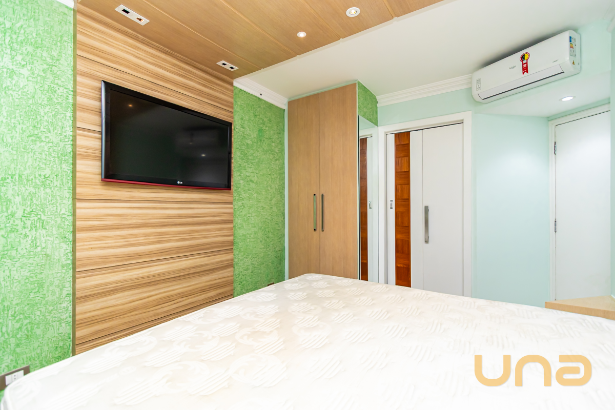 Suíte com armários planejados, cama box, painel com TV e banheiro com TV, duas duchas e box blindex;