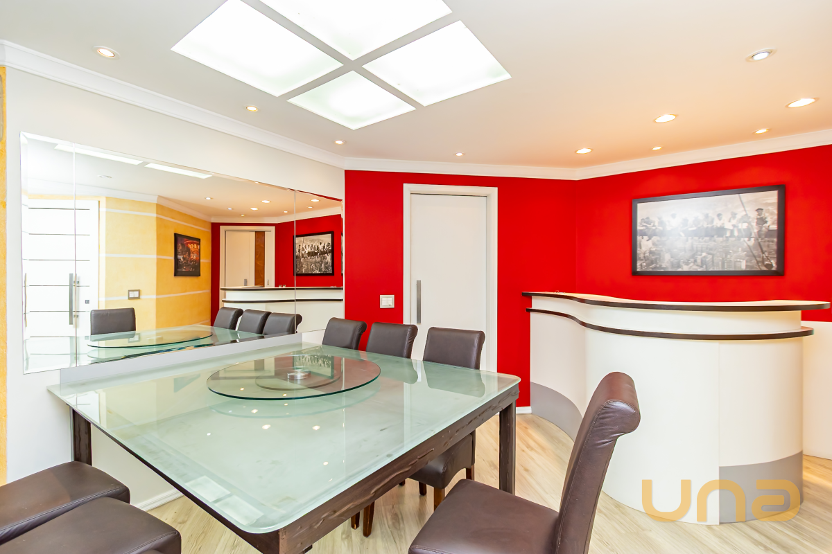 Sala de jantar com mesa de jantar para 8 lugares e bar;