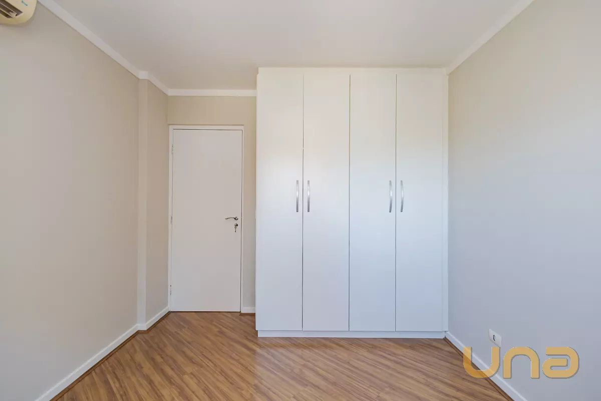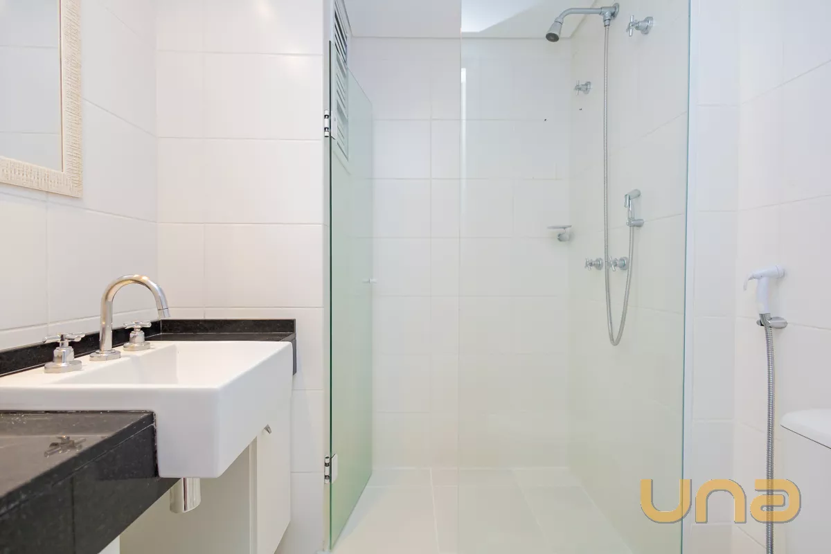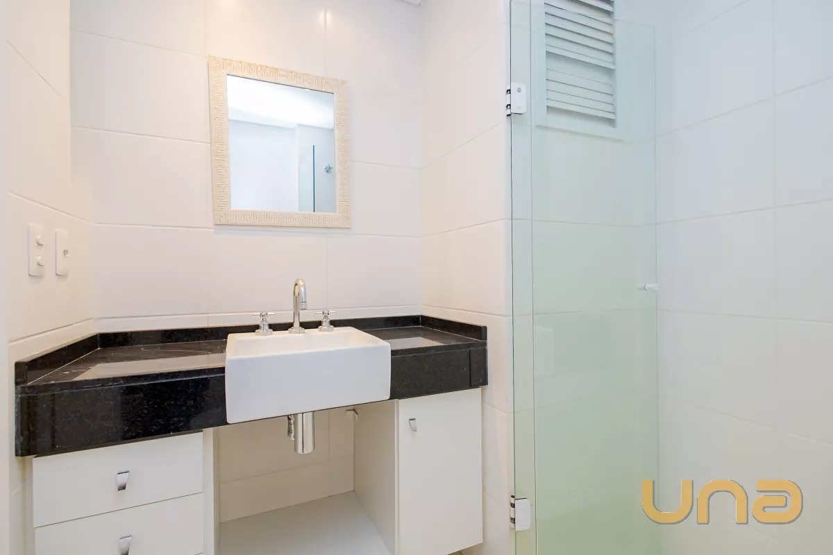 O quarto é um refúgio de tranquilidade, com um armário embutido espaçoso, ideal para manter tudo arrumado. O banheiro, com design atual, conta com armário e blindex, oferecendo funcionalidade e um toque de modernidade.