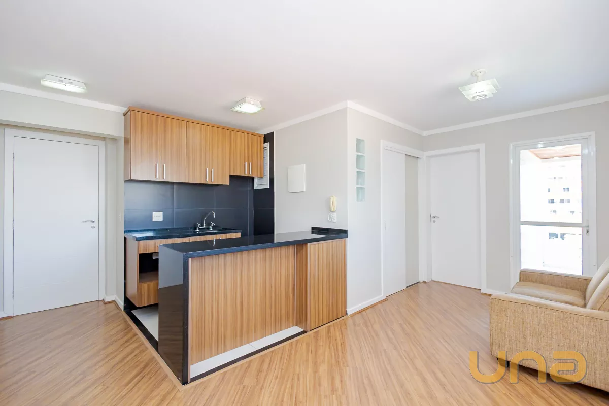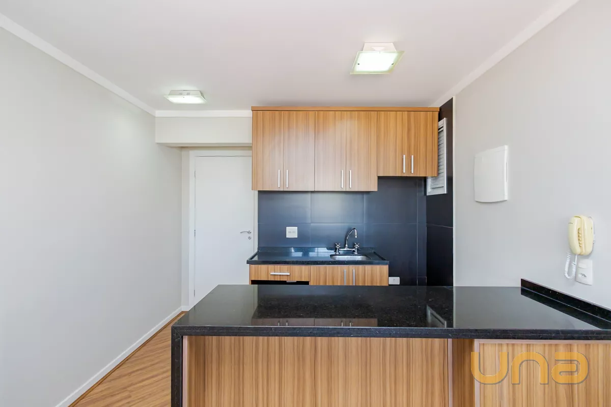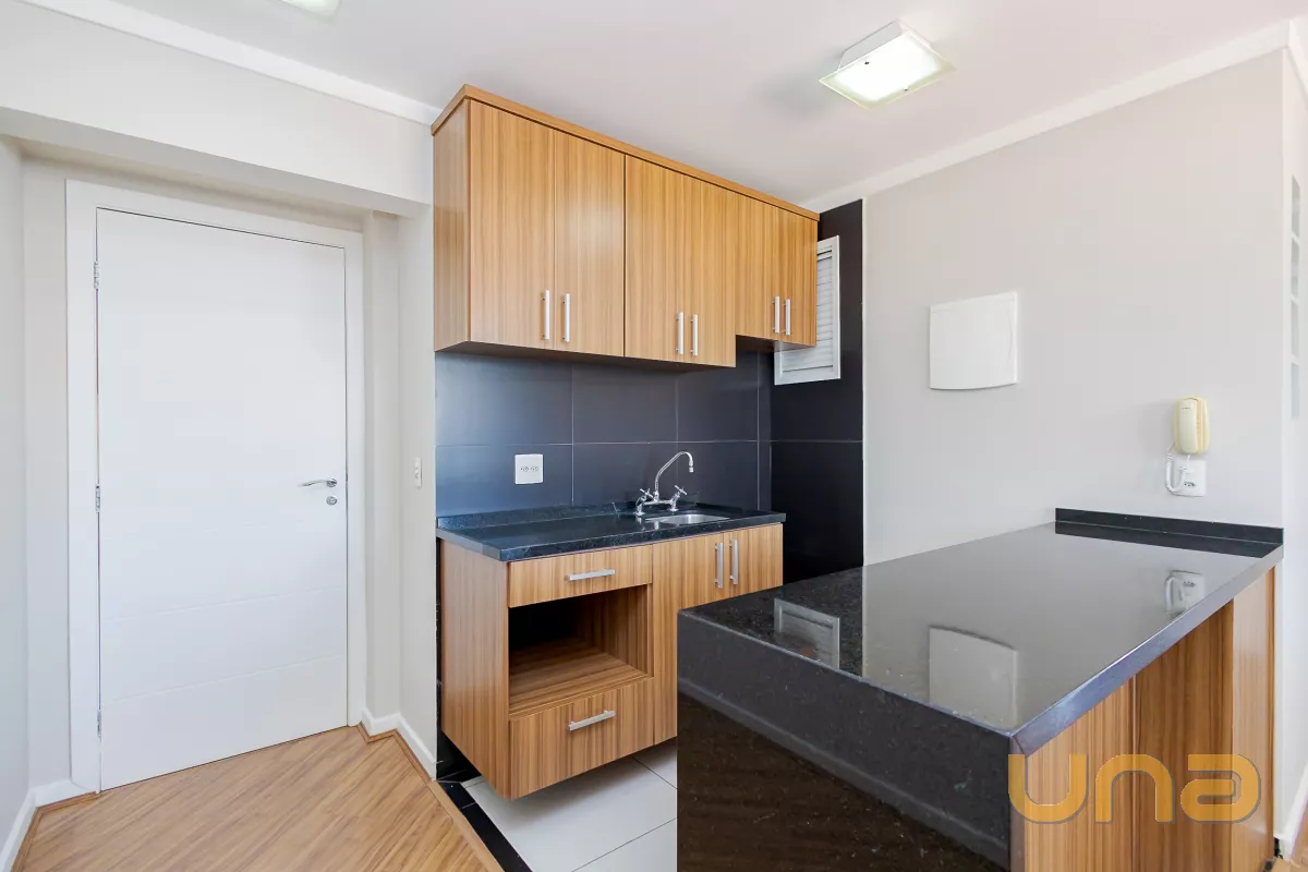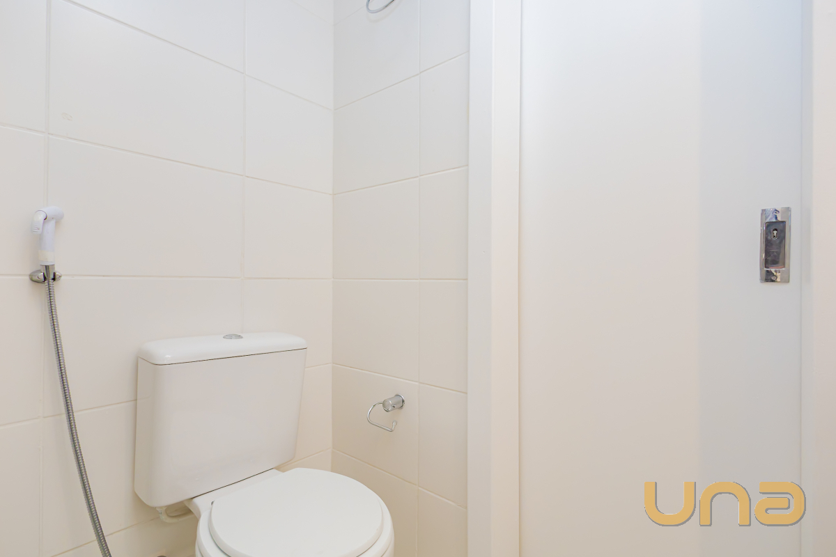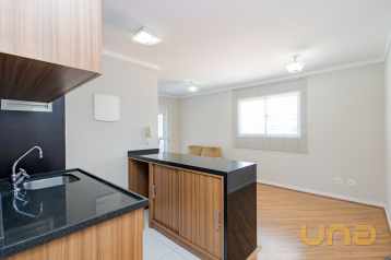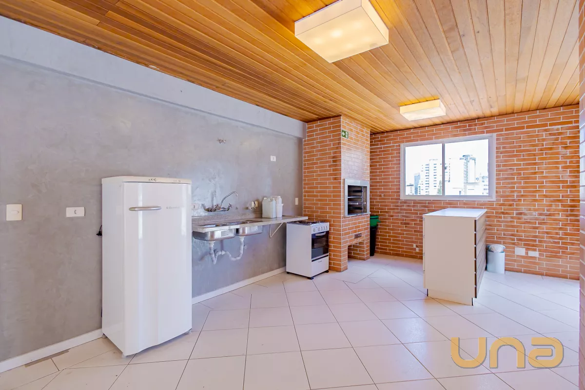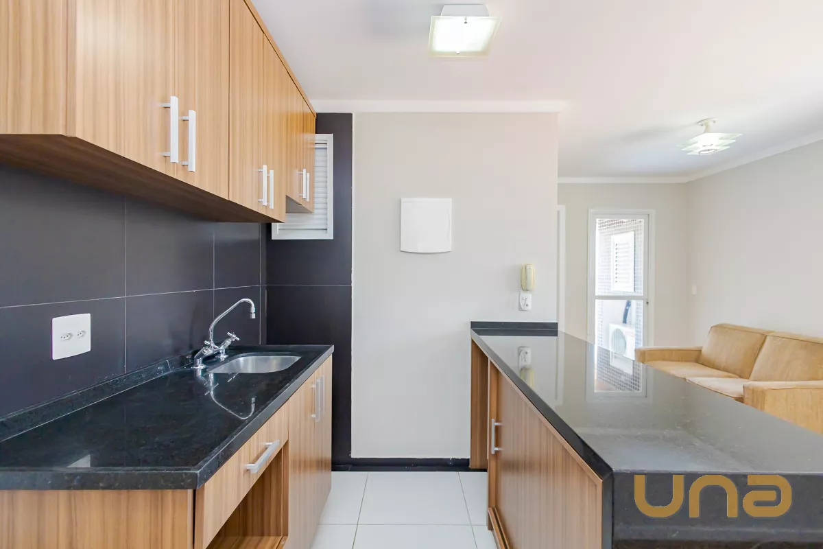 A cozinha americana se integra perfeitamente à sala, criando um ambiente aberto e convidativo. Ela já vem com armários planejados de qualidade superior e um espaço inteligente para o frigobar, garantindo total organização e conveniência.