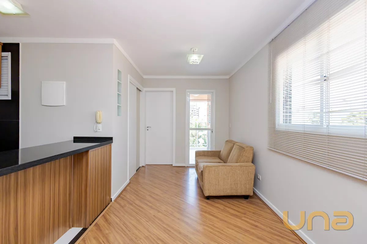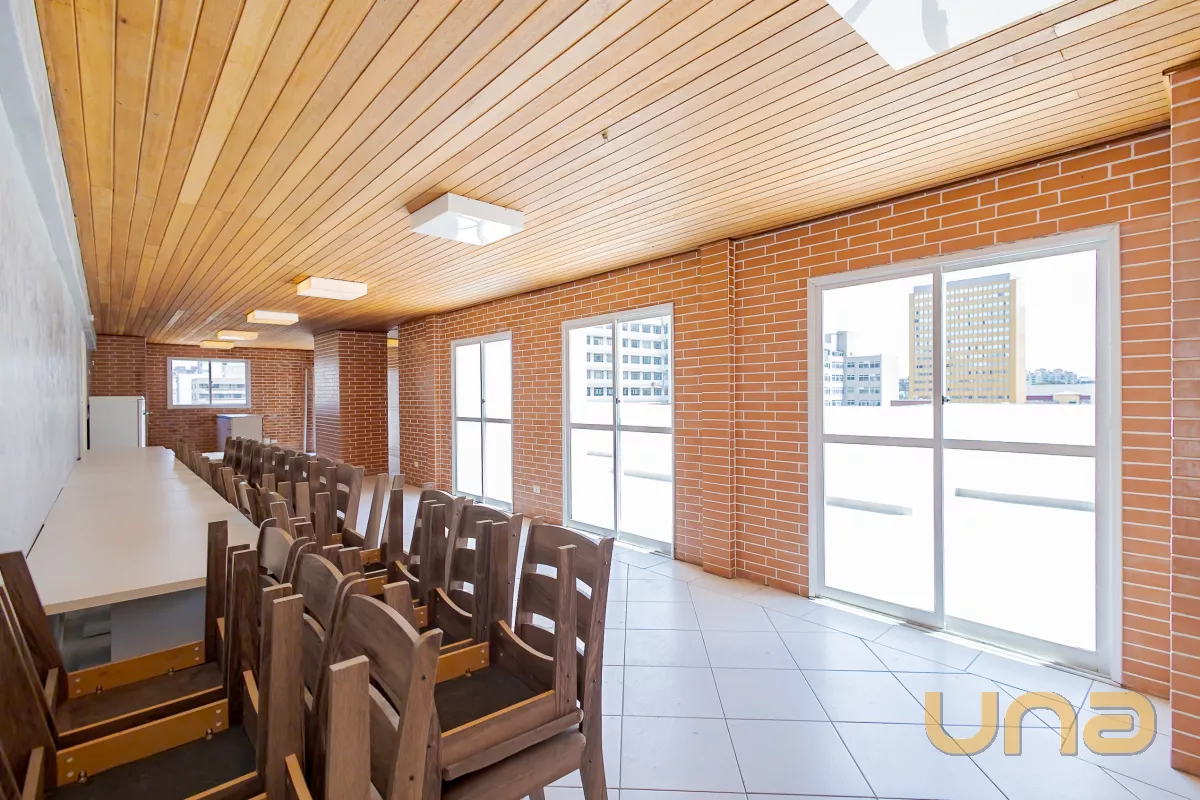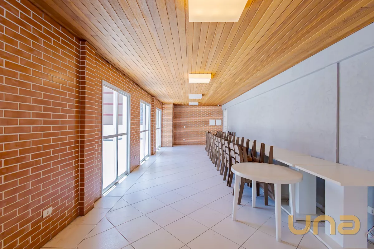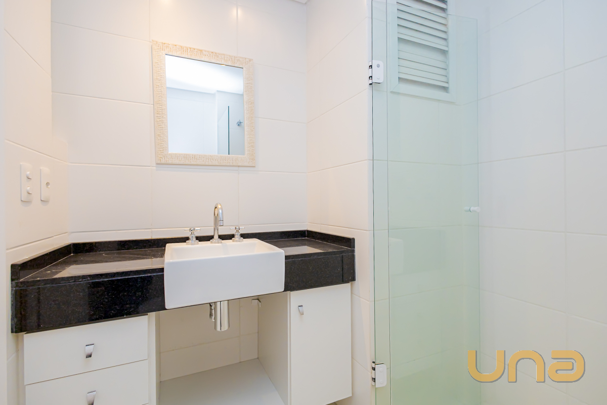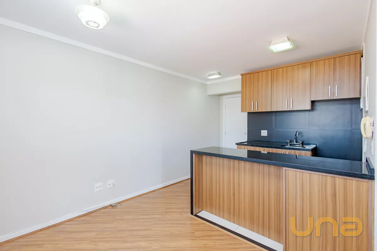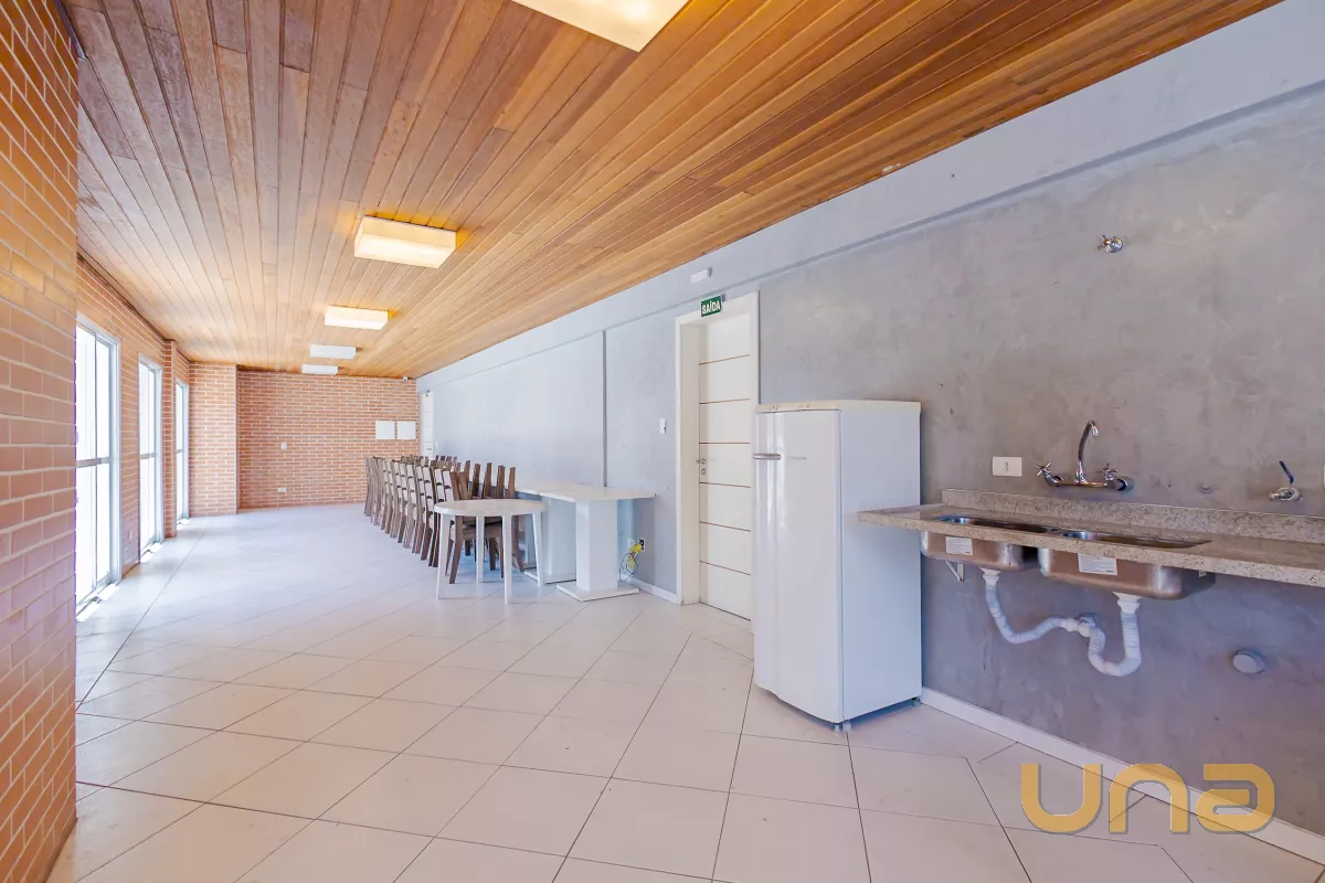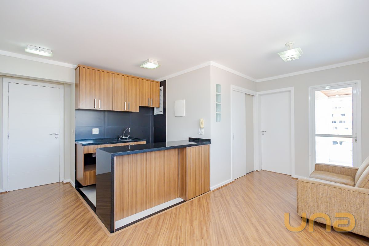 A cozinha americana se integra perfeitamente à sala, criando um ambiente aberto e convidativo. Ela já vem com armários planejados de qualidade superior e um espaço inteligente para o frigobar, garantindo total organização e conveniência.