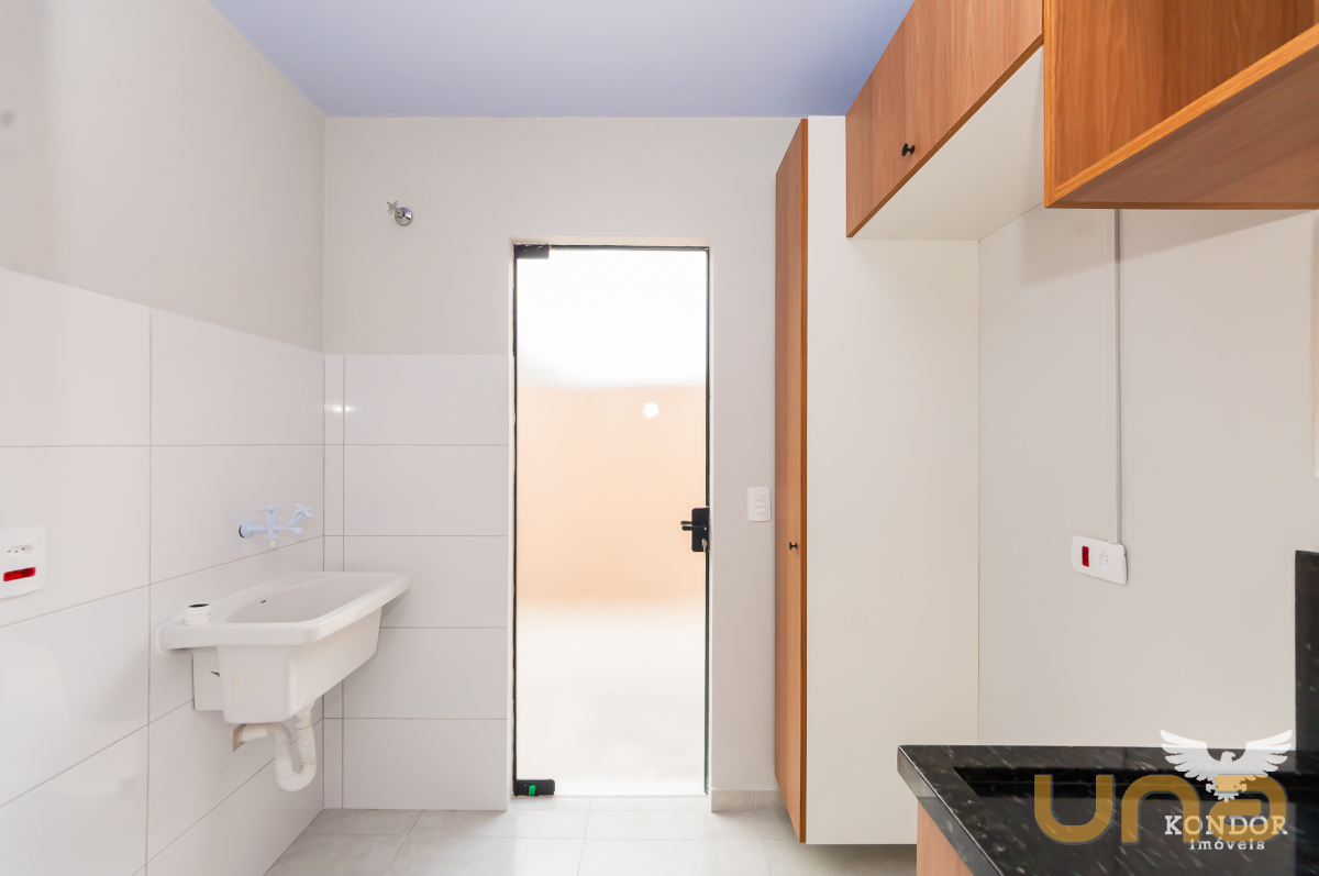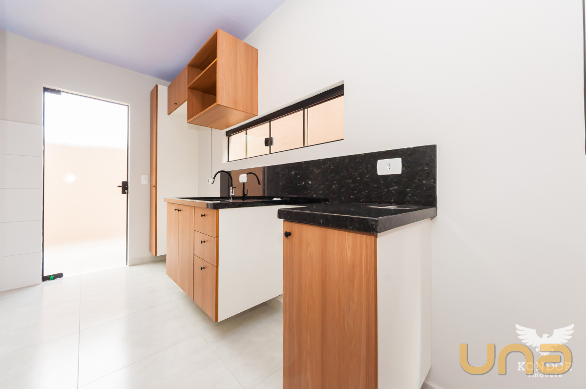 Residencia nova com 02 quartos, sala e cozinha (com armários) conjugados, banheiro social com box e armário, área de serviço, e 01 vaga de garagem descoberta. Imóvel com área livre de terreno na frente e fundos.