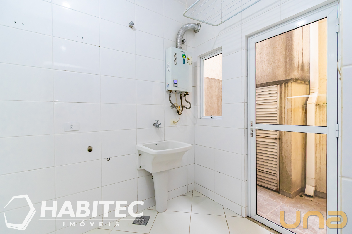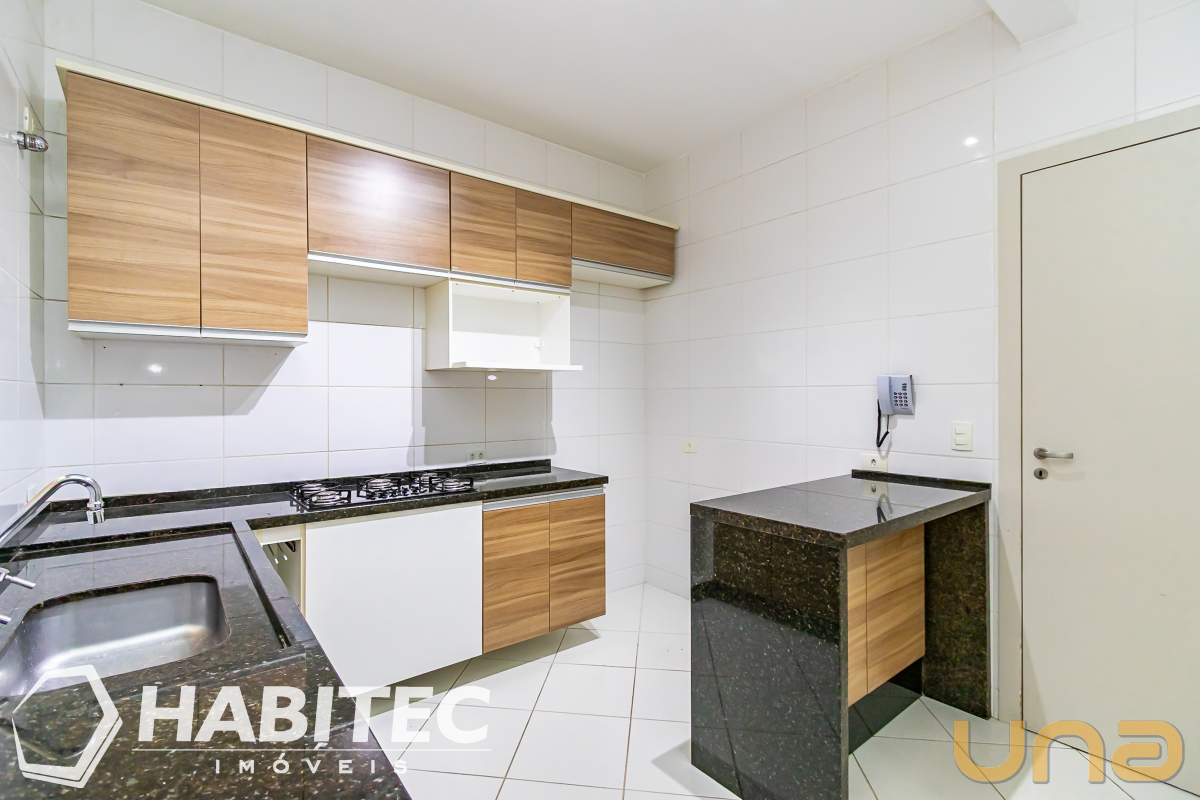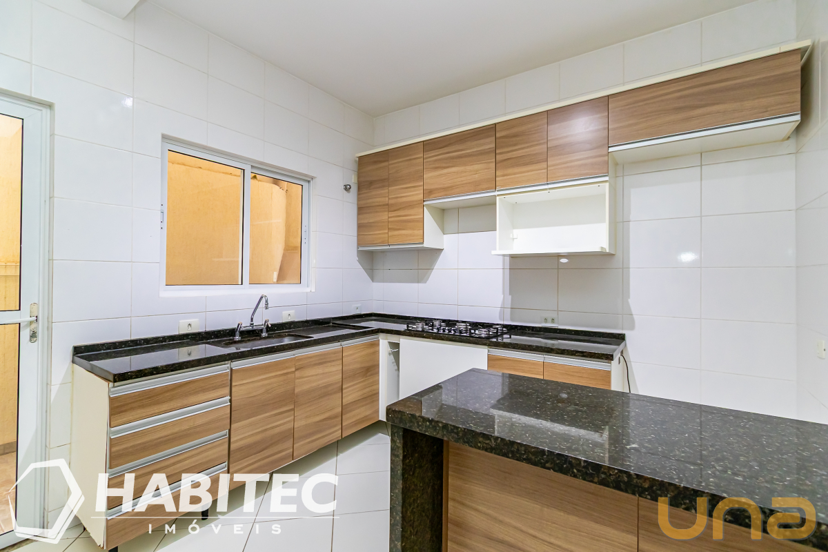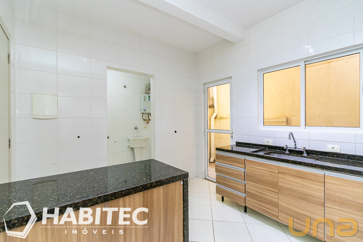 Cozinha com armários, pia, balcão em granito, área de serviço