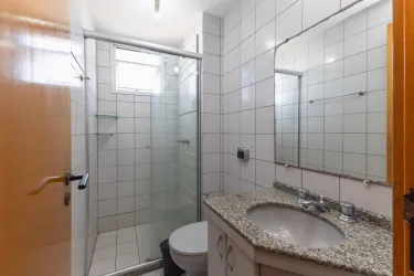 02 Banheiros sendo suíte e social com box em vidro e balcão com tampo em granito
