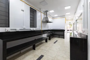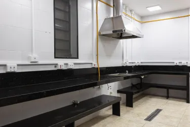 Cozinha estruturada contendo bancada em granito técnica e coifa instalada para suporte operacional