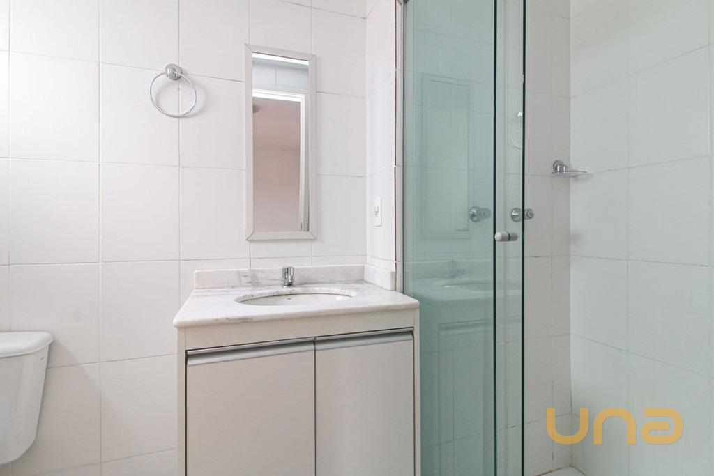 Suíte com banheiro equipado com armário, pia e box em vidro.