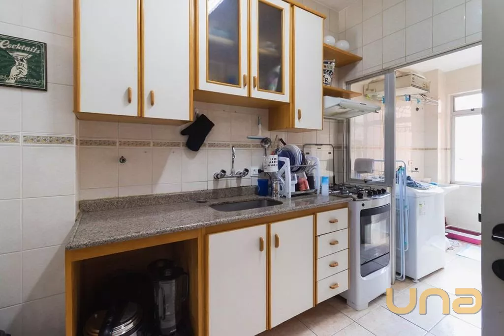 Cozinha com armários planejados, fogão, geladeira, passa prato e pia em granito.