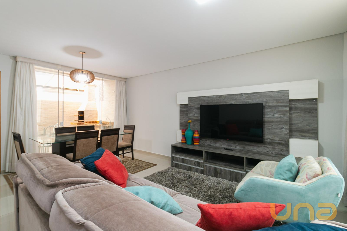 - Sala com teto rebaixado em gesso, lustres, tapetes, mesa em vidro com cadeiras, sofás, cortinas, grades na janela da sala, piso em porcelanato, painel de tv com tv de 55 polegadas e poltrona.