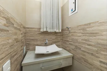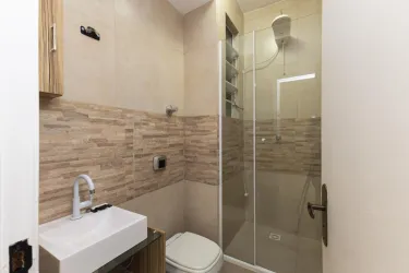 Banheiro privativo equipado com box e chuveiro assegurando autonomia e conforto adicional