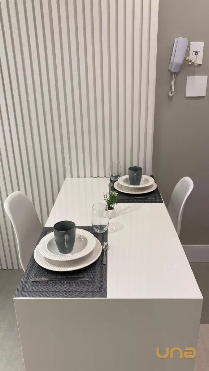 - Cozinha conjugada com armários planejados, pia com tampo em granito, louças, talheres em geral, panelas adequadas para fogão por indução.
