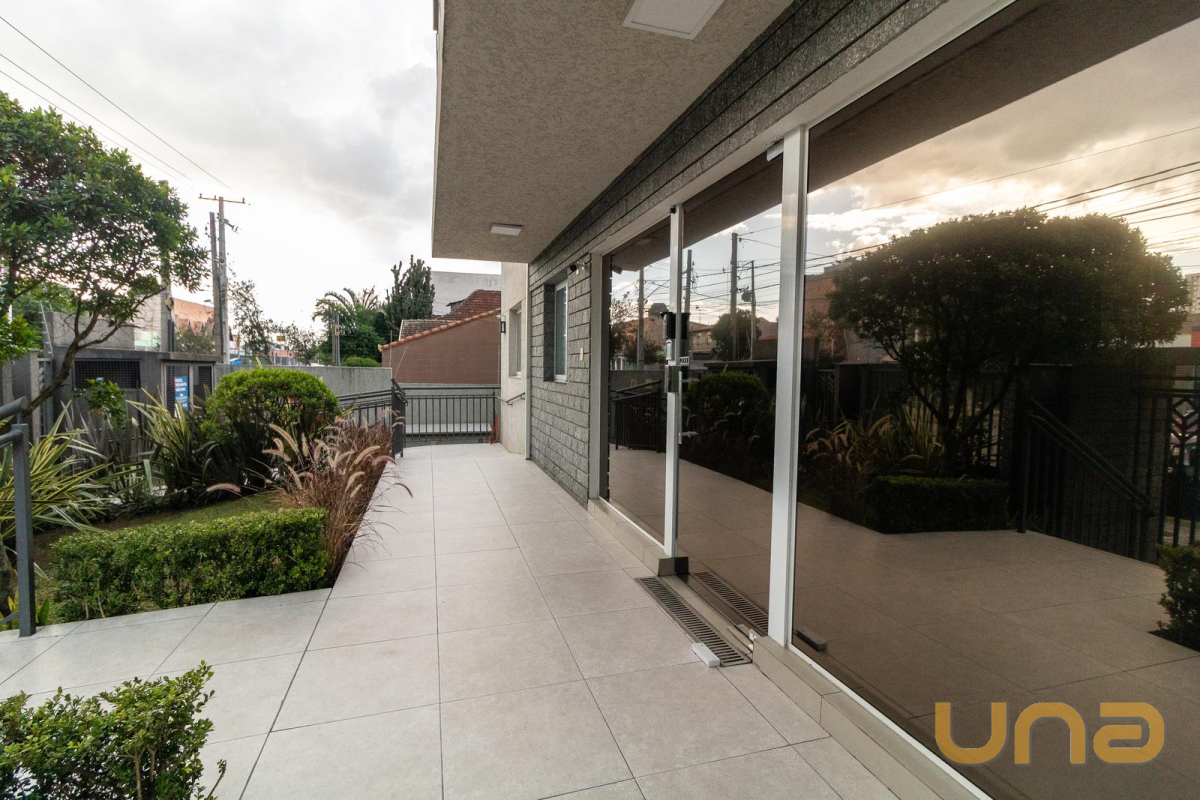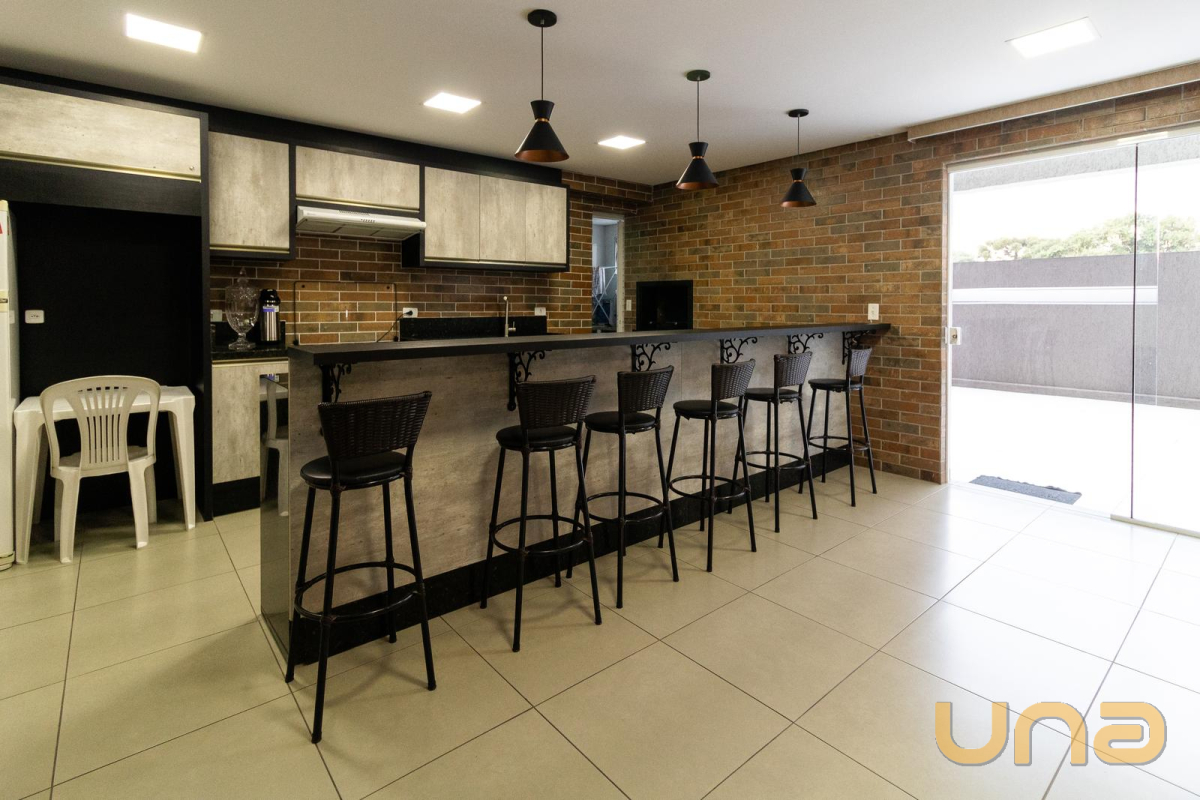 * Sacada com churrasqueira, tampo frontal, cortina corta-sol e piso porcelanato.