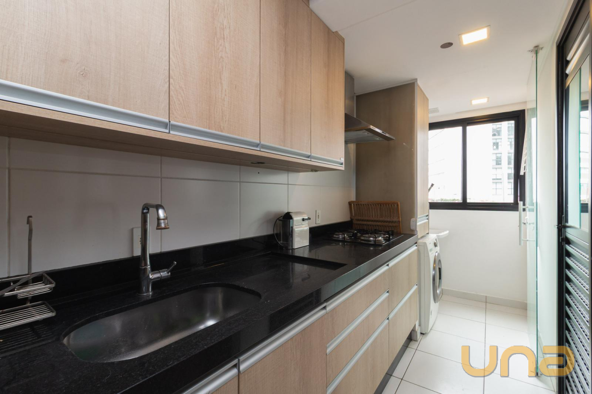Cozinha equipada com pia, armários planejados, cooktop, coifa, forno elétrico, micro-ondas e geladeira.