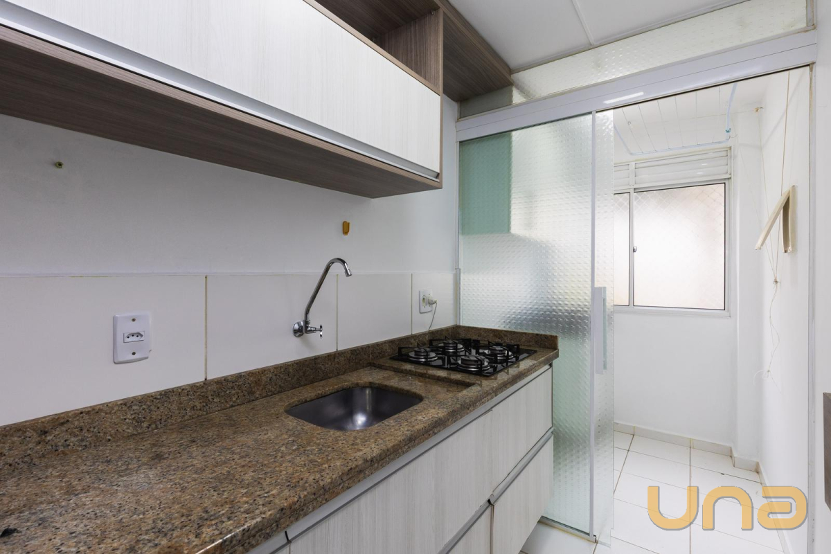 Cozinha mobiliada com armários, pia em granito e cooktop, pensada para oferecer praticidade no dia a dia.