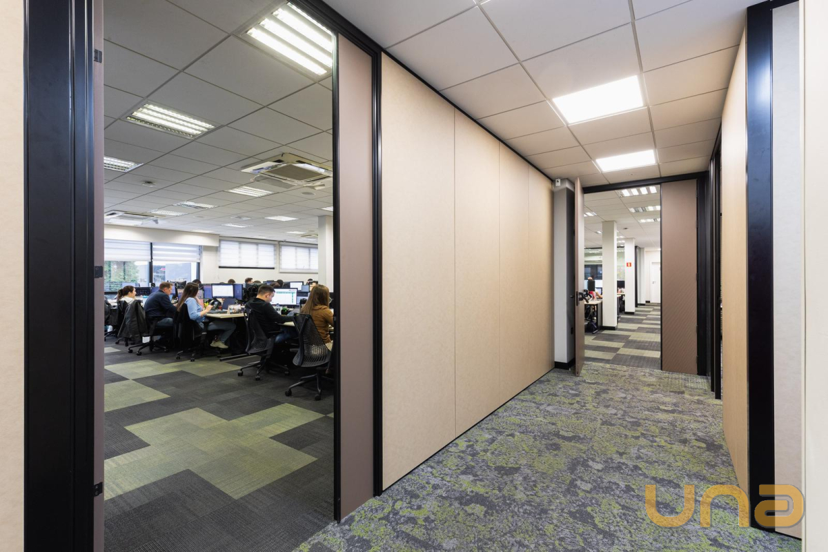 Salas com vão livre, piso carpet e emborrachado, luminárias e ar.