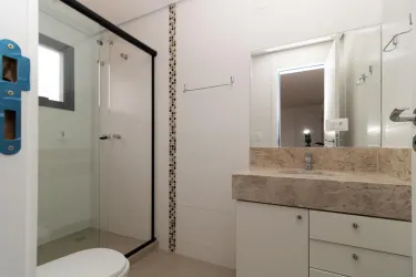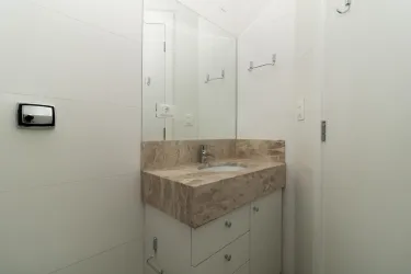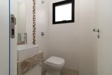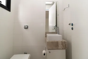 02 Lavabos funcionais com pia, espelho e vaso, ideal para apoio da área social.