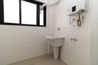 Área de serviço com armário, tanque e espaço para máquina de lavar.