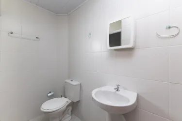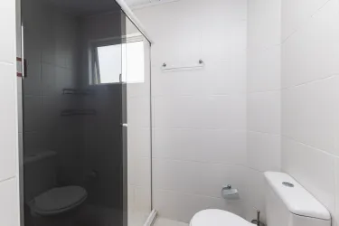 Banheiro social completo contendo vaso sanitário, pia, chuveiro e box instalado