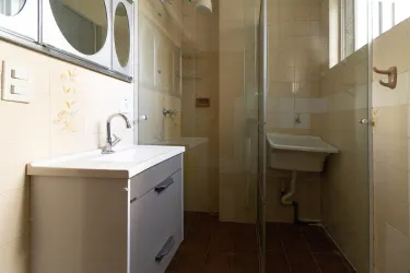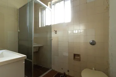 Banheiro social completo estruturado com vaso sanitário pia box e chuveiro instalado