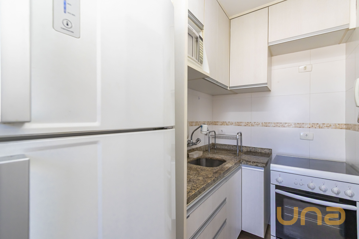 Cozinha com armário, pia em granito, equipada com fogão 4 bocas, forno elétrico, micro-ondas e geladeira;