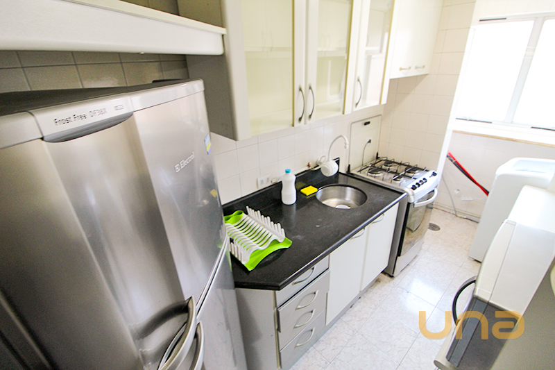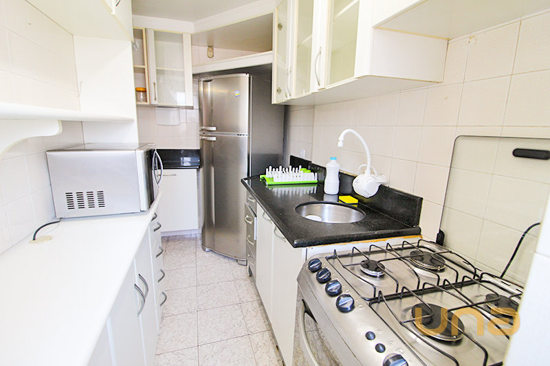 Cozinha com armário, pia com tampo granito, geladeira, fogão e micro-ondas;