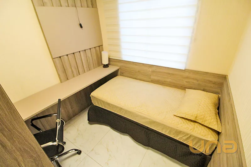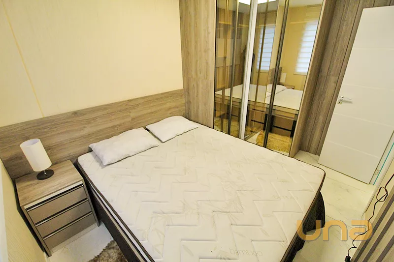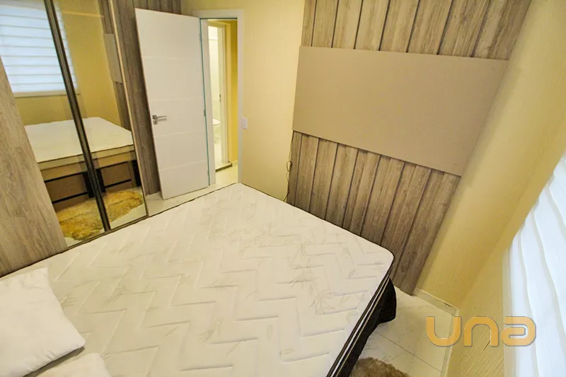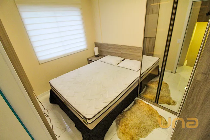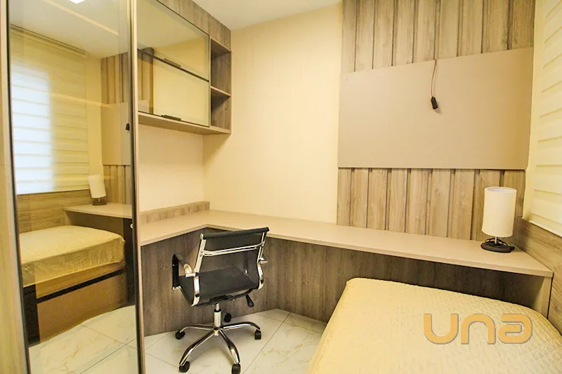 02 Quartos com piso cerâmico e persiana, sendo 01 com cama box casal, armário, painel para TV, cabeceira, criado-mudo, tapete; e 1 cama box solteiro, armário, painel de TV, cabeceira, escrivaninha com cadeira;