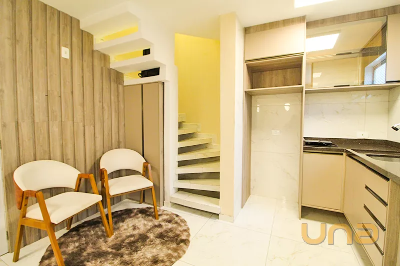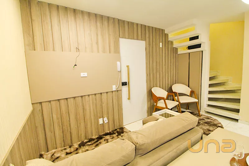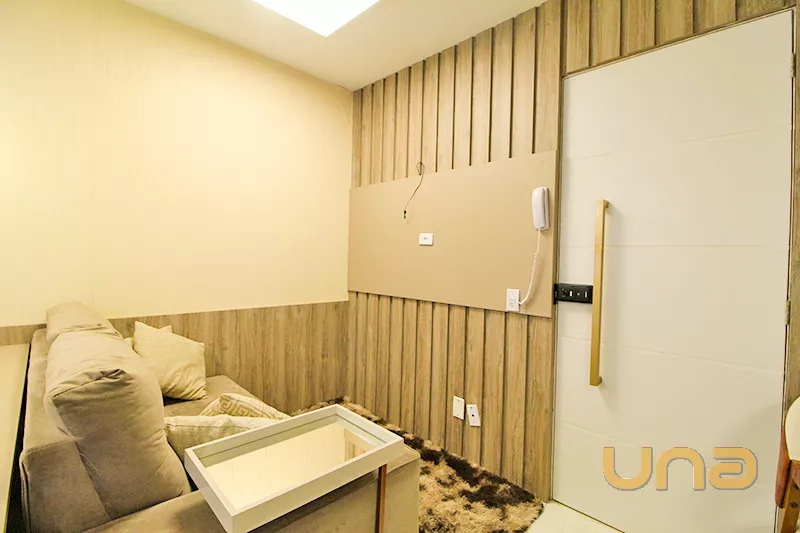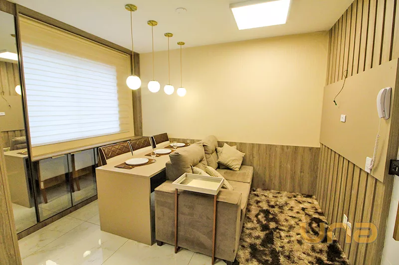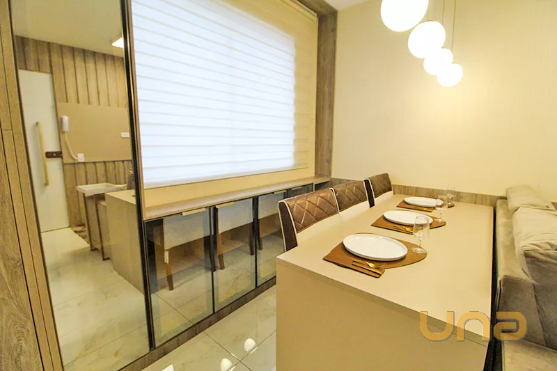 Sala para 02 ambientes, com sofá, painel para TV, 2 tapetes, 2 poltronas, armários com portas espelhadas, mesa e 03 cadeiras, persiana, iluminação especial;