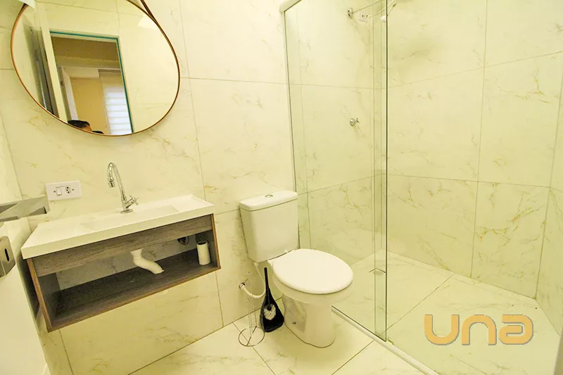 Banheiro com box blindex, pia com armário, aquecimento elétrico.