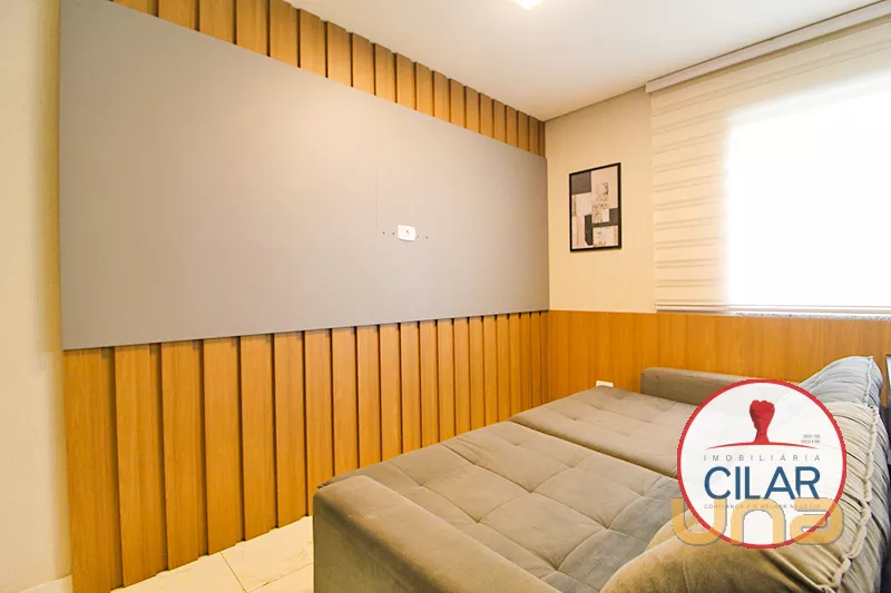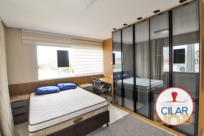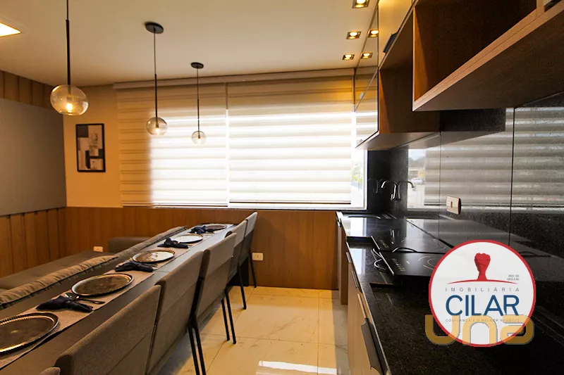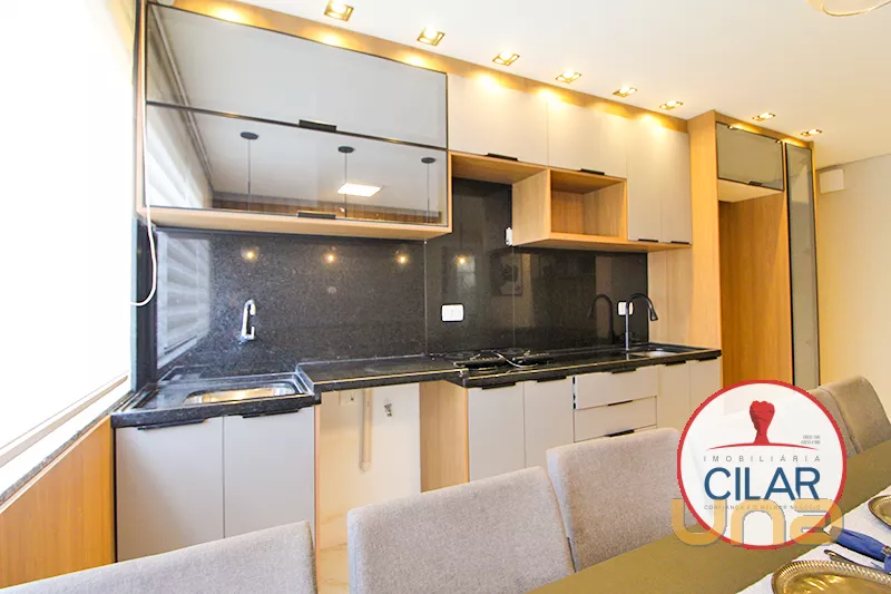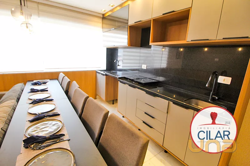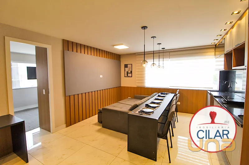 Apartamento contendo 1 Quarto com cama box casal, 2 criados-mudos, armário e escrivaninha com 1 cadeira; Sala com sofá, painel de TV e armários; Banheiro com box de blindex e aquecimento elétrico; Cozinha com armários planejados, pia em granito com balcão, cooktop indução, mesa com 6 cadeiras e balcão ilha