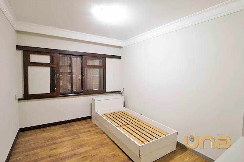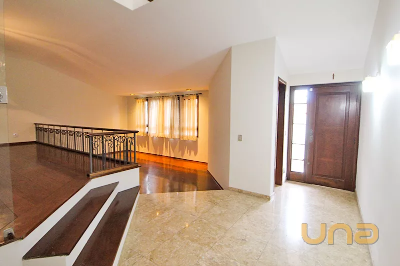 Residência com 3 quartos, 1 quarto com armários, 1 suíte com closet com armários e hidromassagem; 1 banheiro social com box blindex; 1 sala de jantar; 1 sala para 2 ambientes com piso 2 níveis de madeira; 1 lavabo; 1 cozinha com armários, pia em granito, 1 mesa de granito pequena; 1 dependência de empregada; Piso laminado nos quartos.