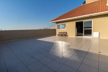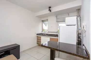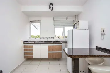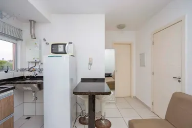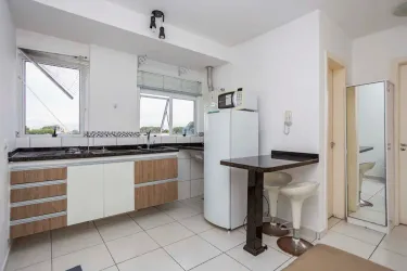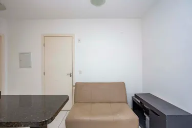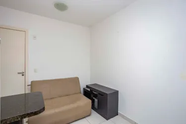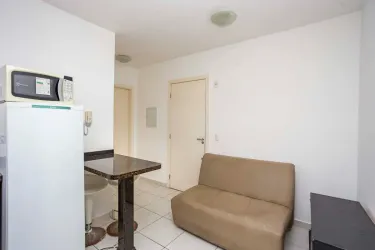 01 Sala com sofá de 02 lugares, conjugada com cozinha com balcão tampo granito, 01 mesa pequena com 02 banquetas, 01 geladeira, 01 micro-ondas;