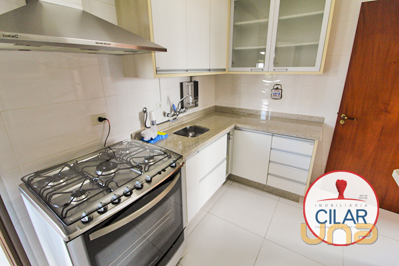 Cozinha toda mobiliada com armários, pia e bancada em granito, fogão, filtro de agua e coifa;