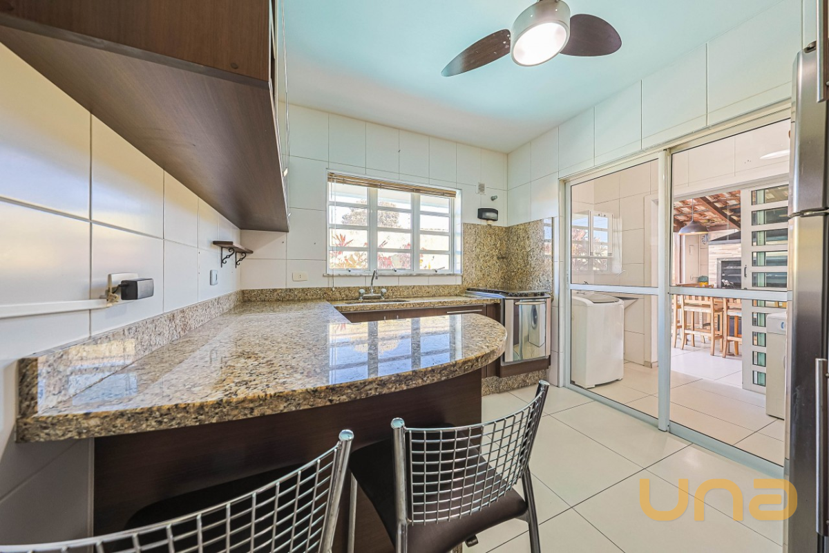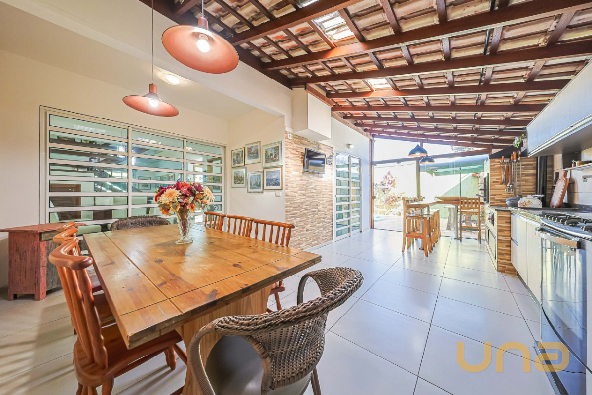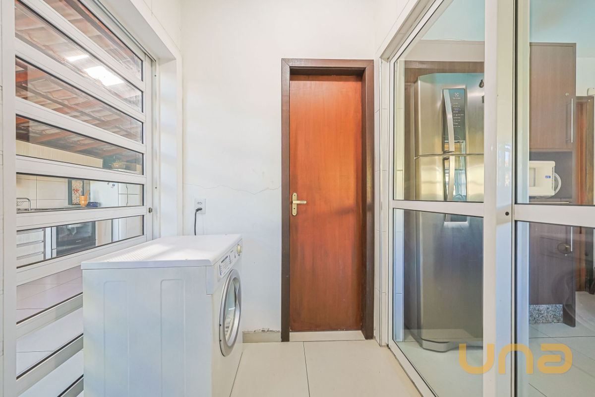 Pavimento térreo com sala ampla, copa, lavabo e cozinha equipada com móveis planejados, além de lavanderia com banheiro social (que também funciona como apoio para a piscina). A área gourmet espaçosa, com armários embutidos e churrasqueira.