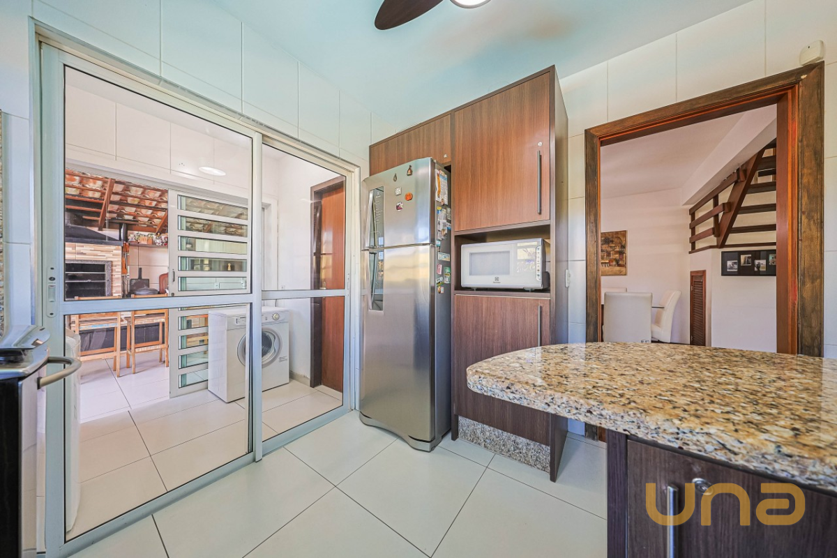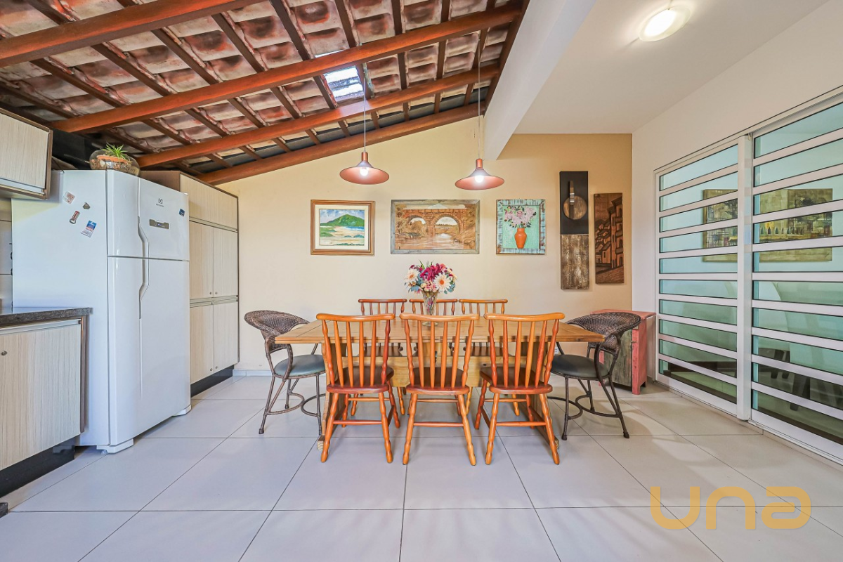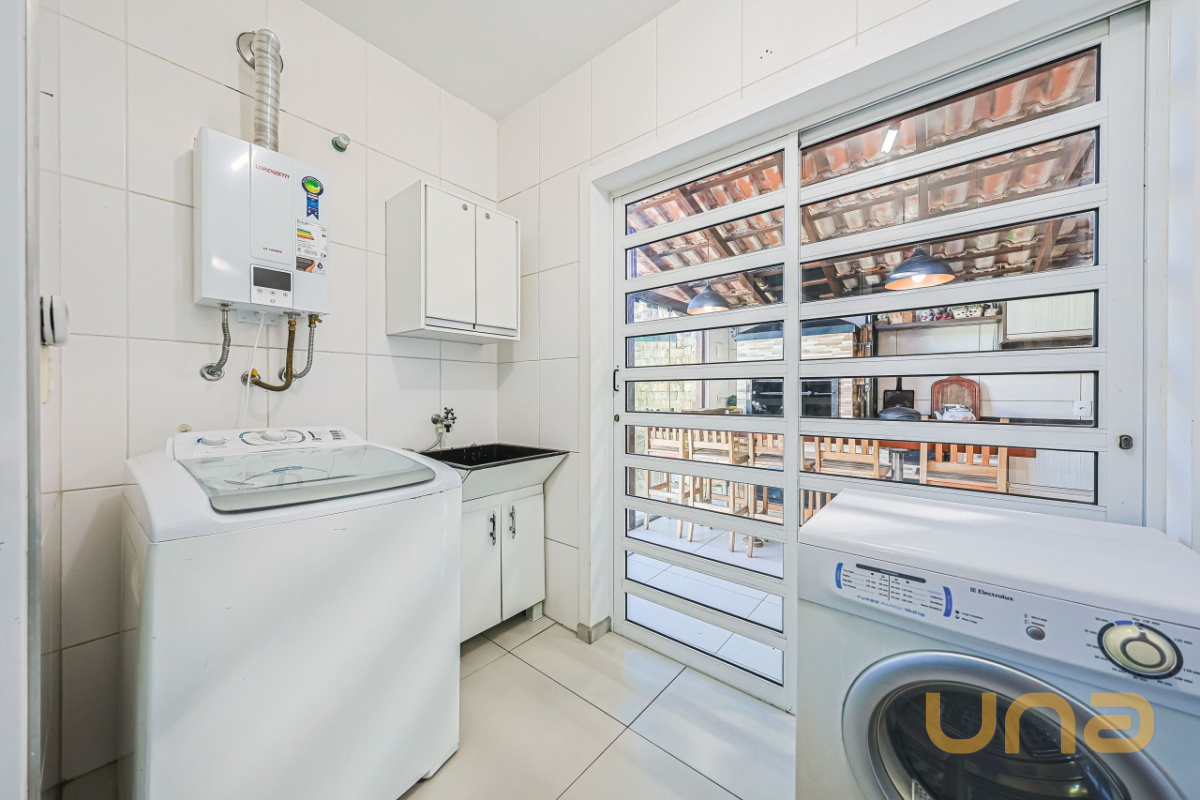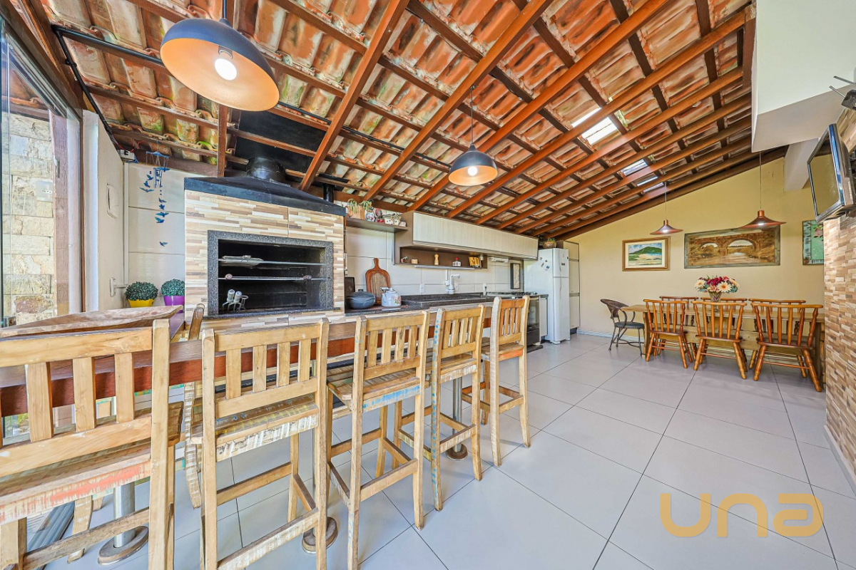 Pavimento térreo com sala ampla, copa, lavabo e cozinha equipada com móveis planejados, além de lavanderia com banheiro social (que também funciona como apoio para a piscina). A área gourmet espaçosa, com armários embutidos e churrasqueira.