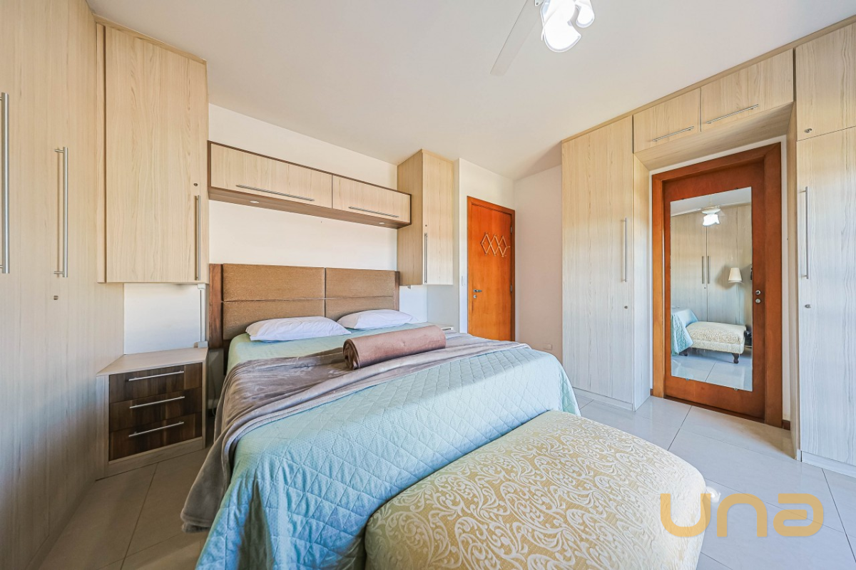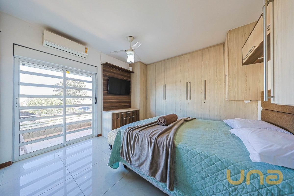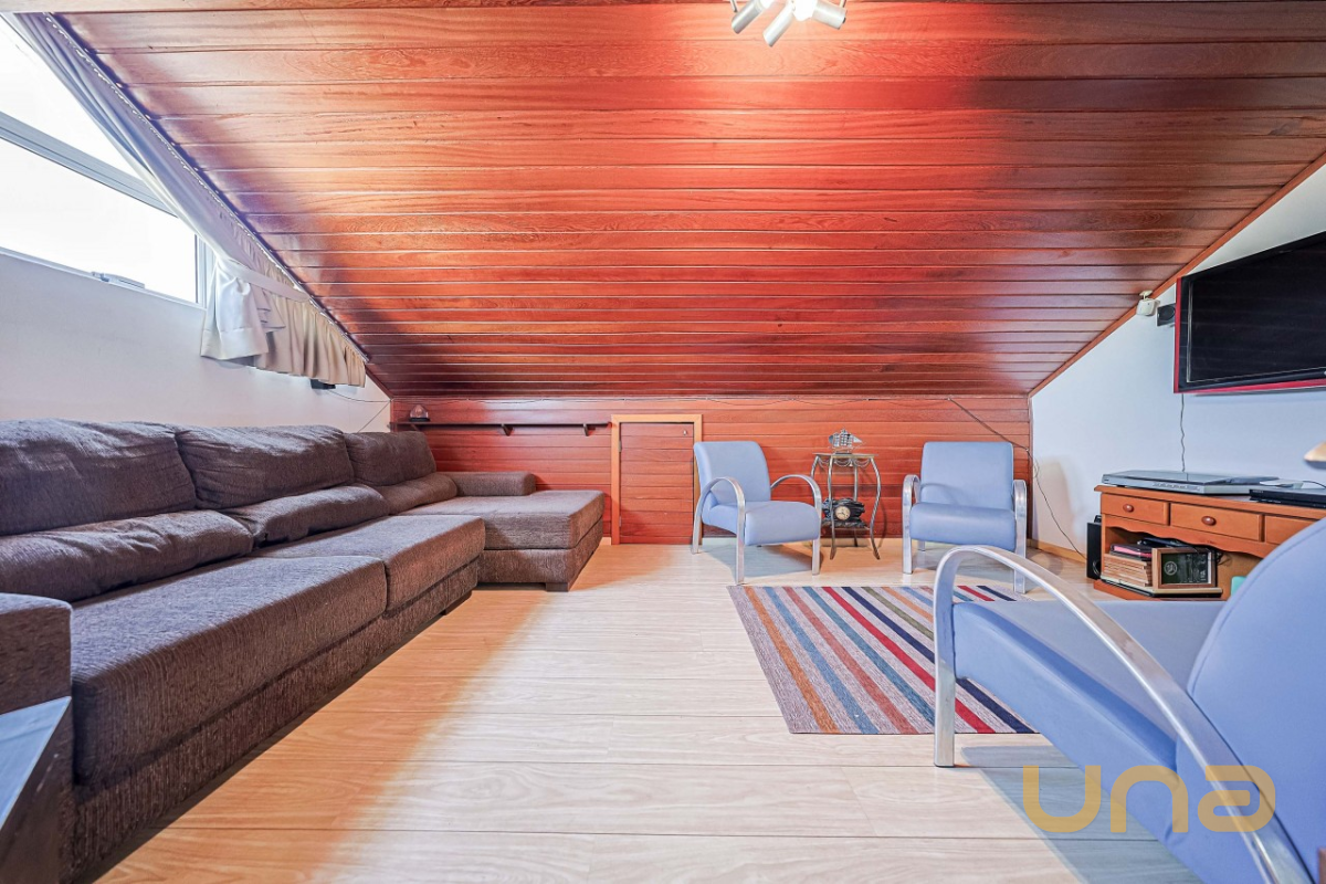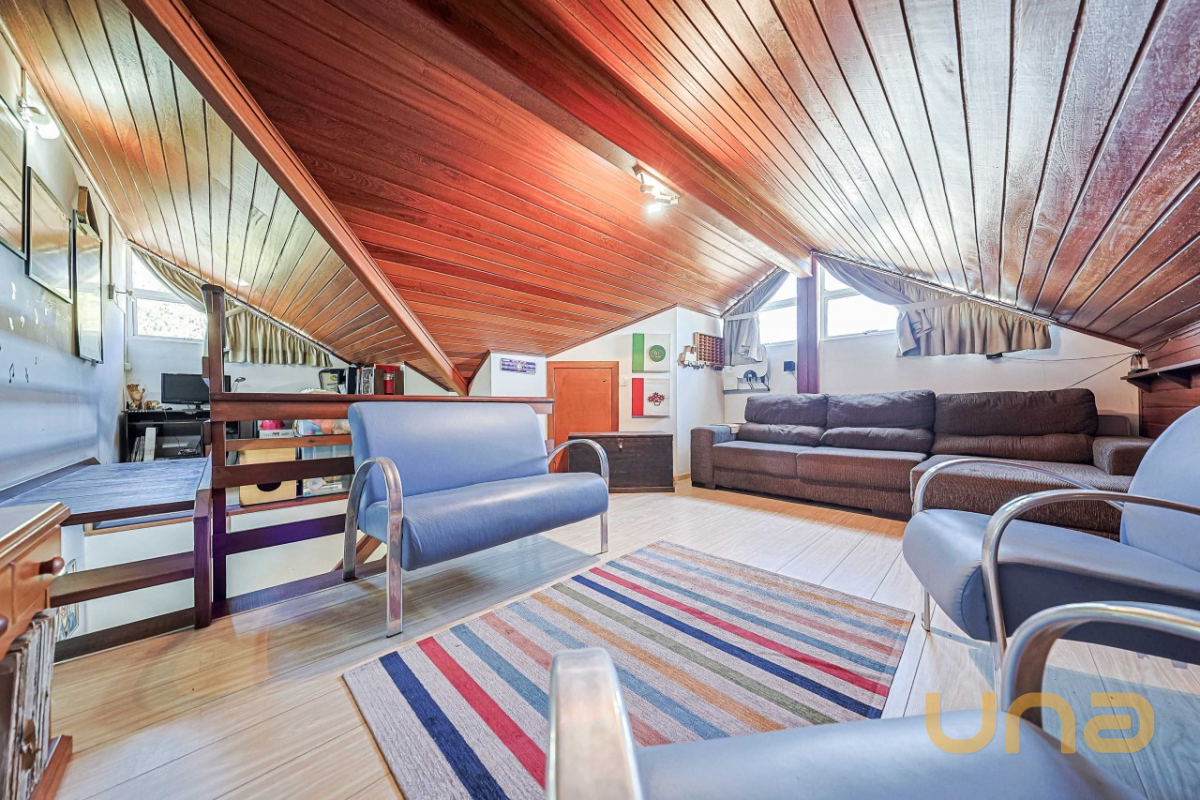 No segundo piso, são 03 dormitórios, todos com ar-condicionado e armários. A suíte master ainda dispõe de sacada com vista para a piscina. Banheiros (social e privativo) com armários, box de vidro e aquecimento a gás. Já no ático, há uma aconchegante sala de estar e um escritório — perfeito para home office ou momentos de leitura.