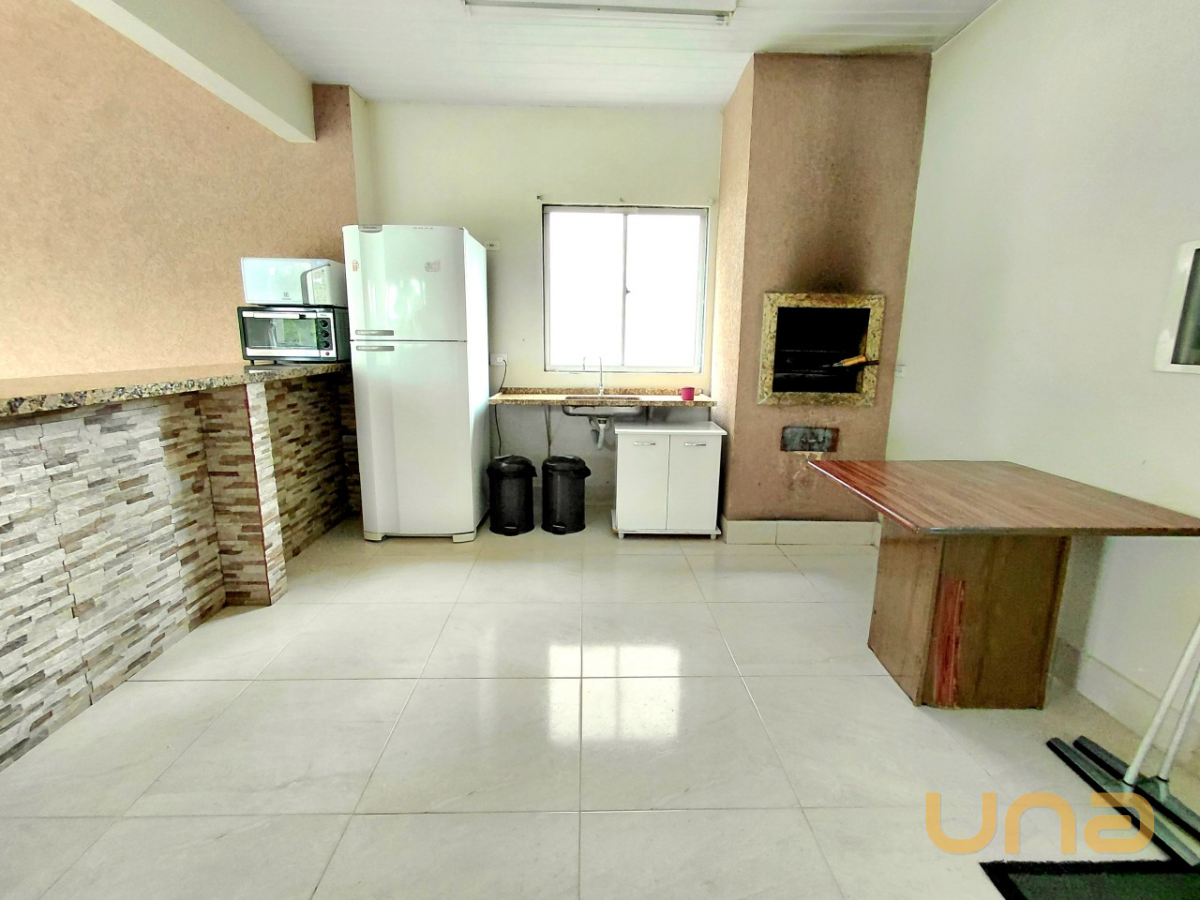 01 Sala com sofá, rack, TV, mesa de jantar com cadeiras. Cozinha com armários planejados, geladeira, forno, cooktop, micro-ondas e área de serviço conjugada com máquina de lavar roupas.