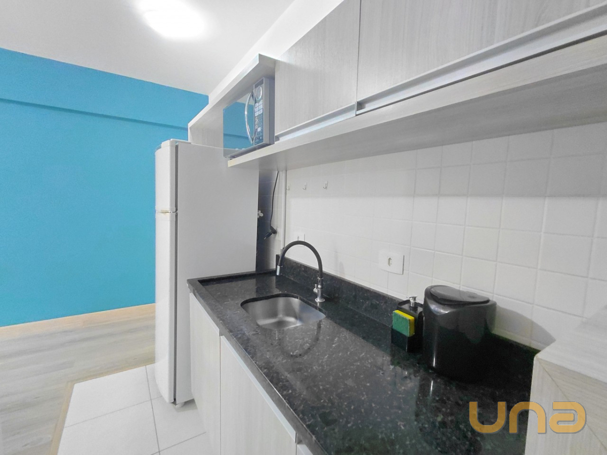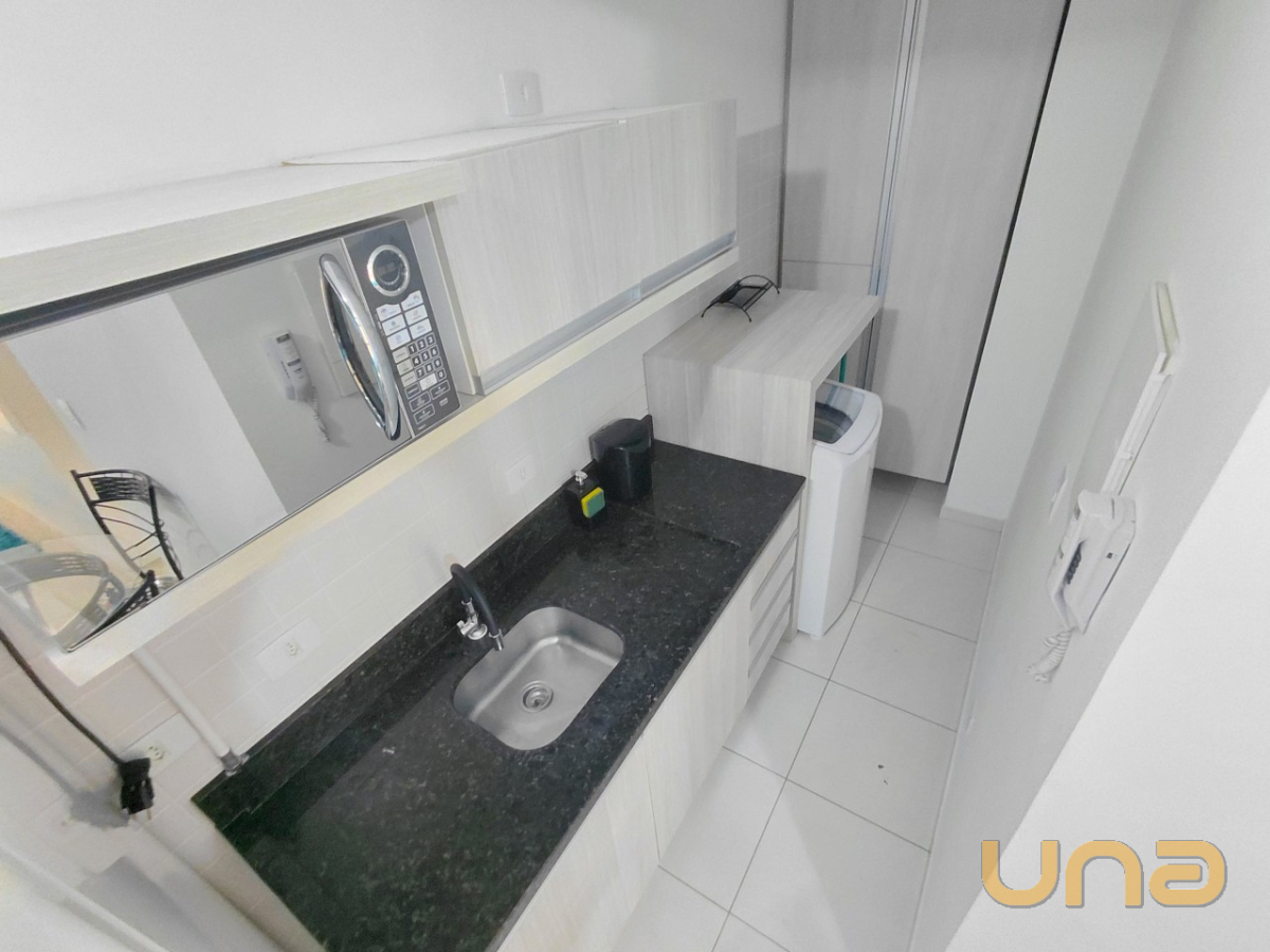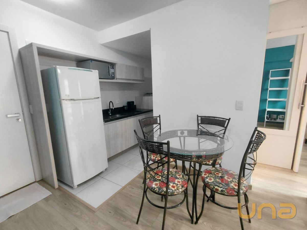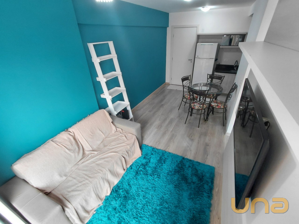 O imóvel com 01 dormitório equipado com armário embutido e painel para TV, cozinha integrada com armários planejados, micro-ondas, geladeira e lavadora de roupas. A sala possui painel e TV, sofá e mesa com quatro cadeiras, banheiro está equipado com chuveiro a gás, box em blindex e espelho.
